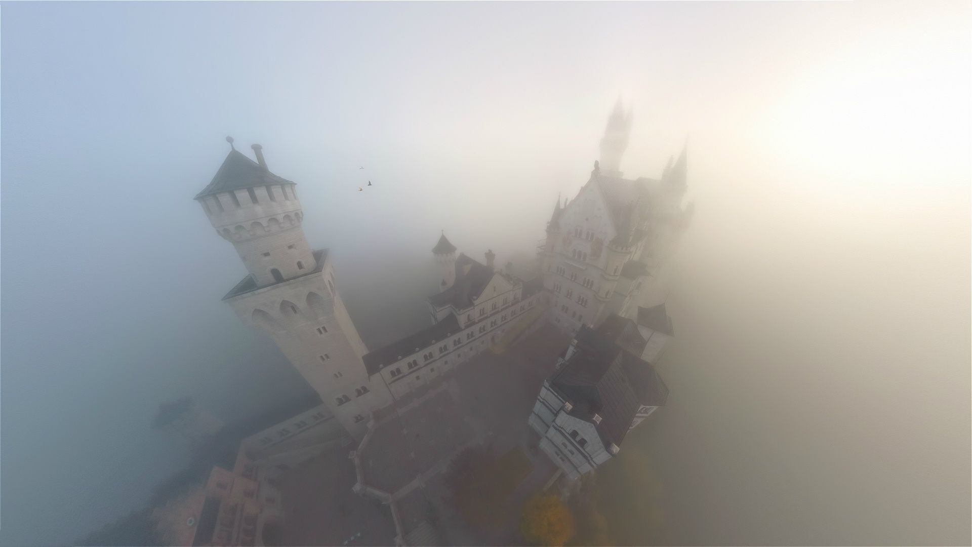 Castello nella nebbia intorno all'acqua