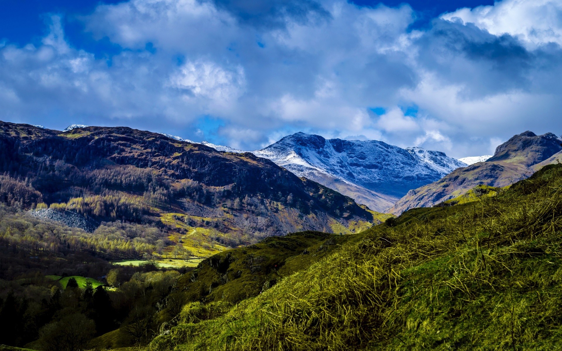 Paesaggio di montagna. Nuvole bianche, prato alpino e montagne all'orizzonte