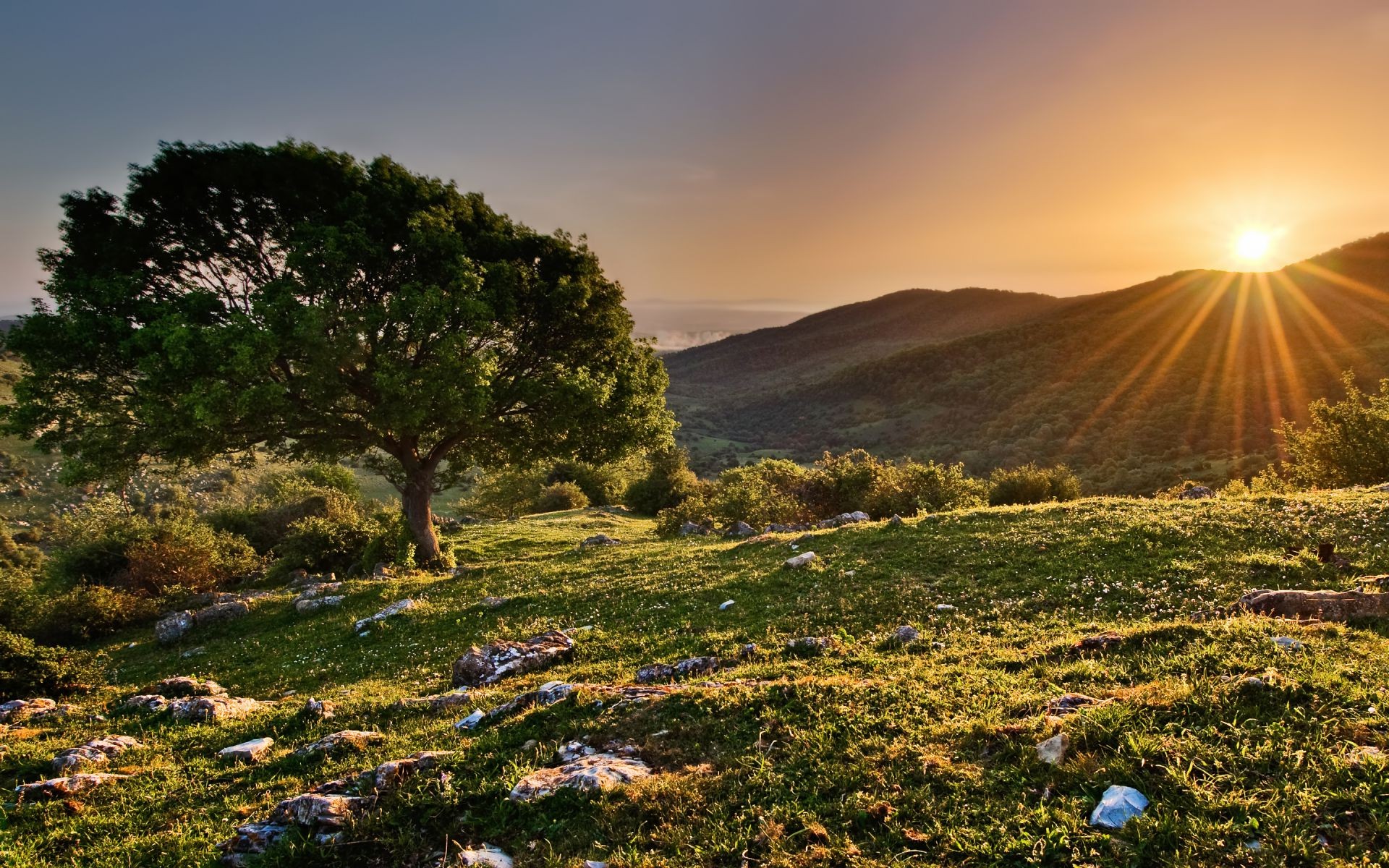 Tramonto sulle montagne, possenti alberi, prati lussureggianti