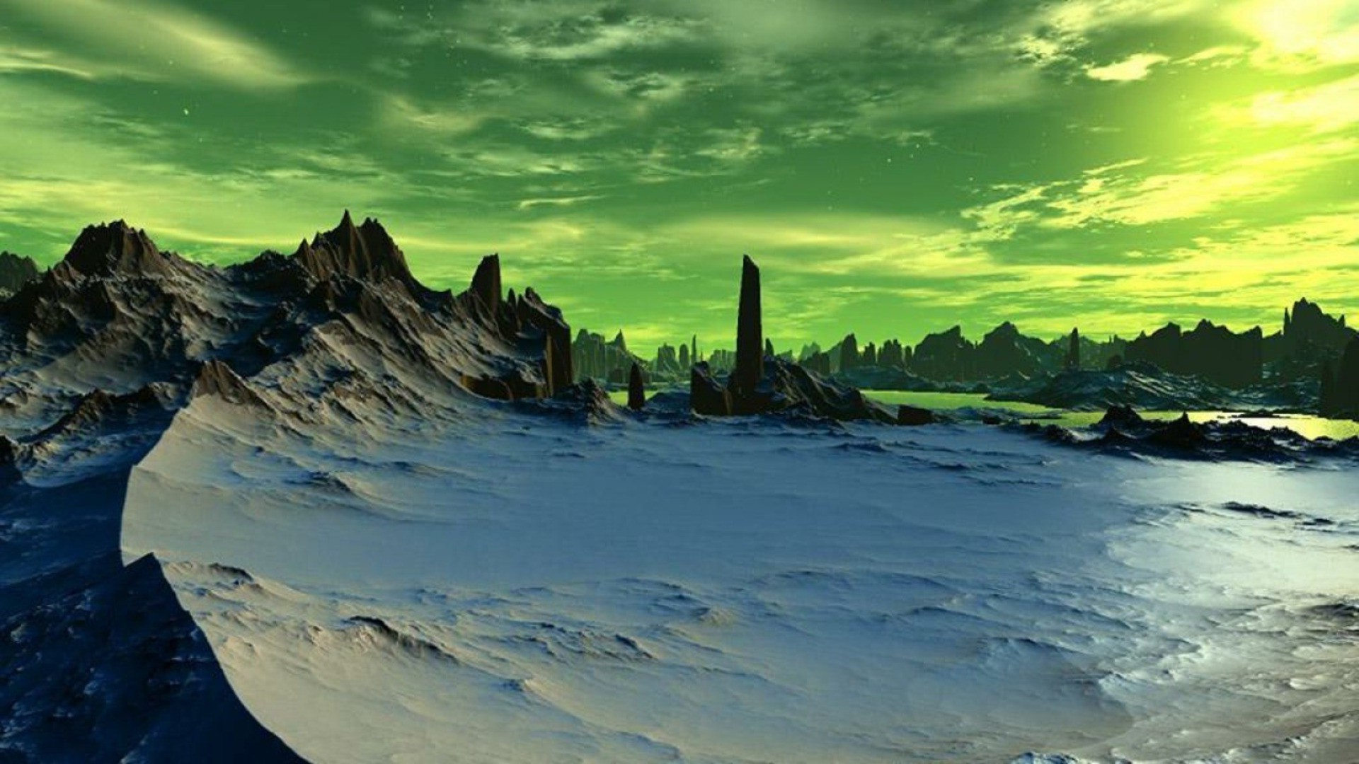 Alberi verde brillante contro le cime delle montagne e il cielo blu