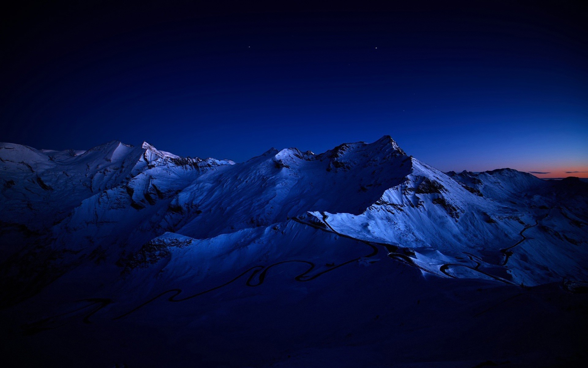 Spettacolare tramonto sullo sfondo di montagne coperte di neve