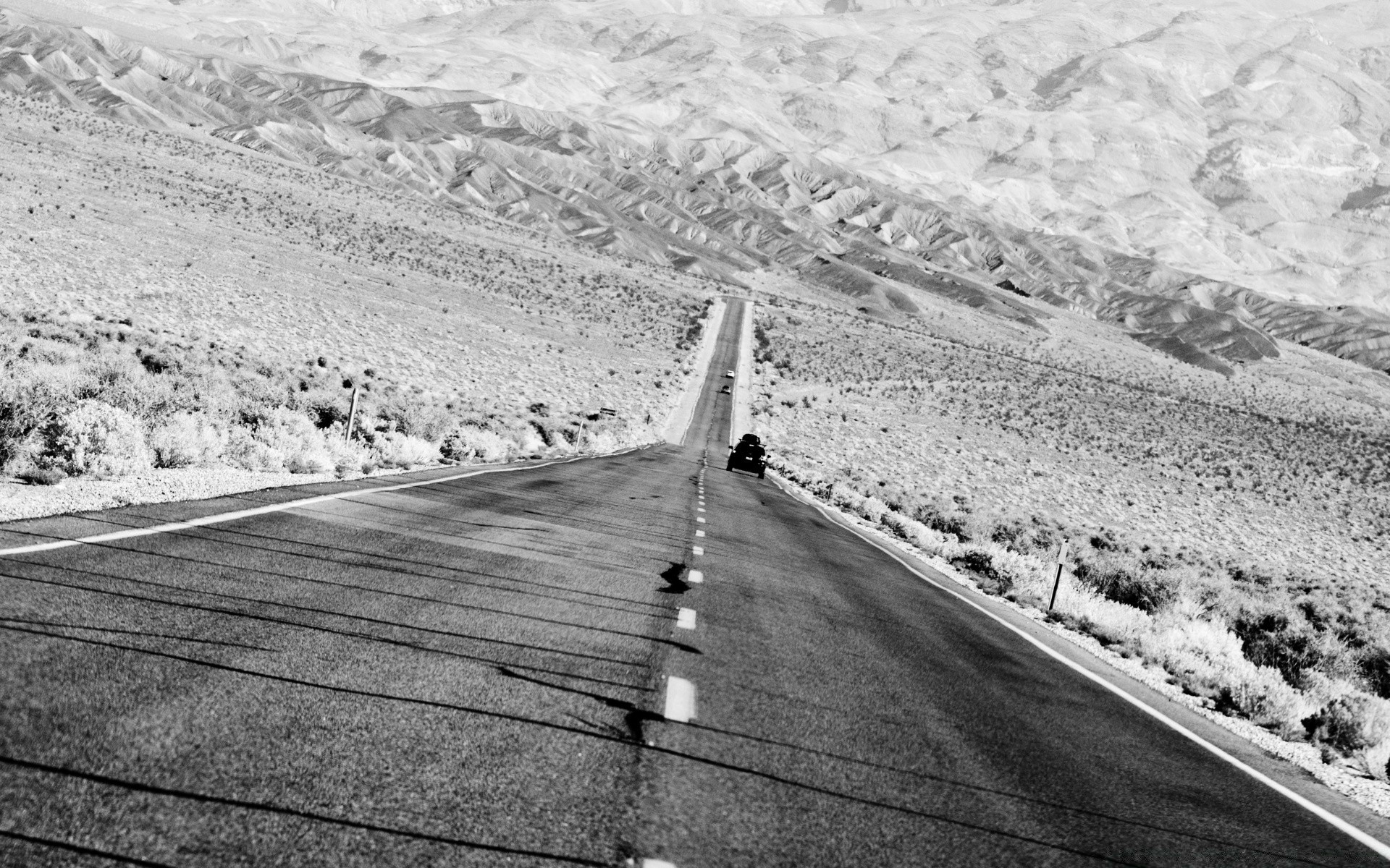 Strada nella zona desertica sullo sfondo delle montagneStrada nella zona desertica sullo sfondo delle montagne
