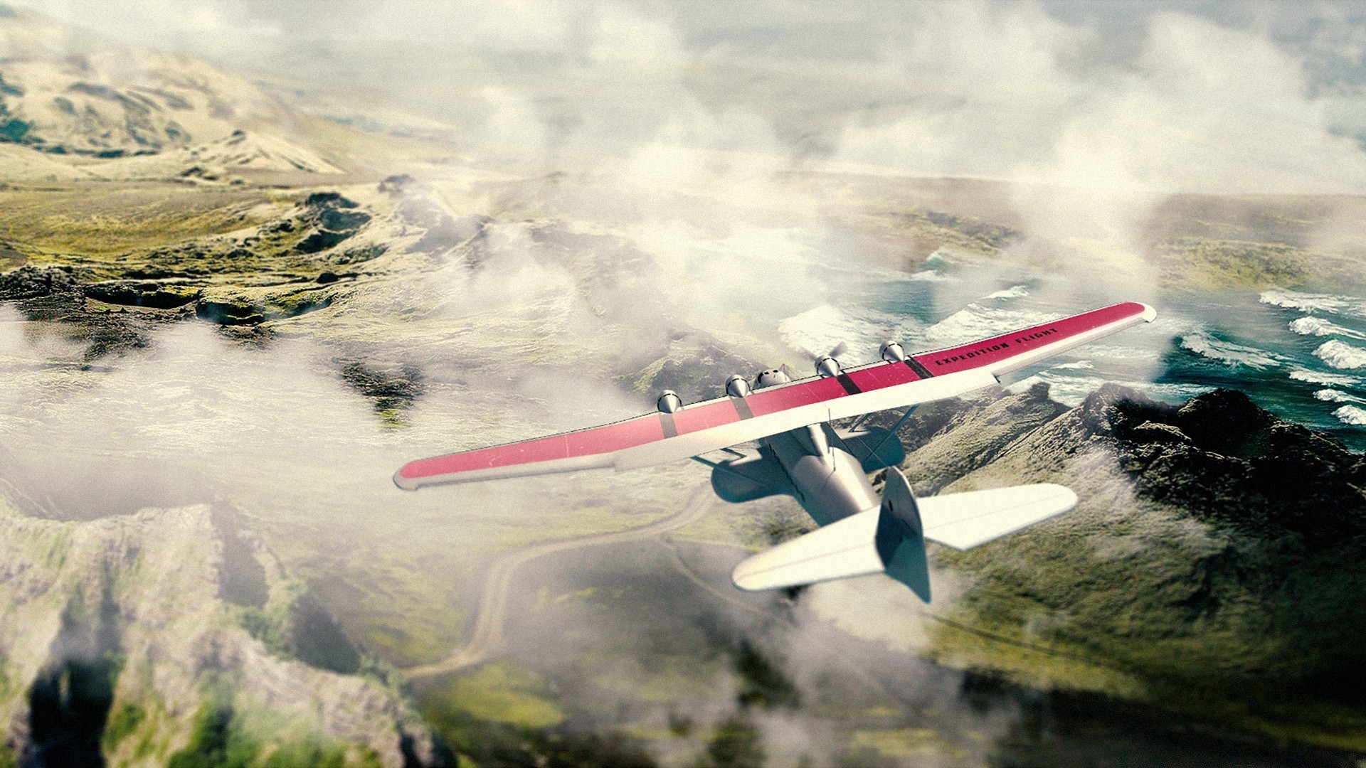 Illustrazione di un aereo su uno sfondo di montagne e nuvole