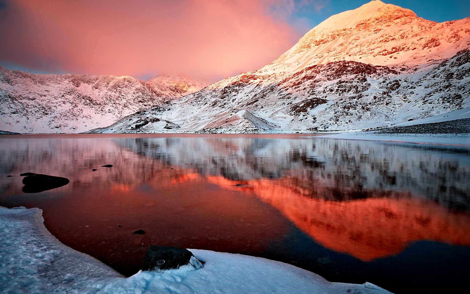 Magnifiche montagne innevate e il loro riflesso nell'acquaMagnifiche montagne innevate e il loro riflesso nell'acqua