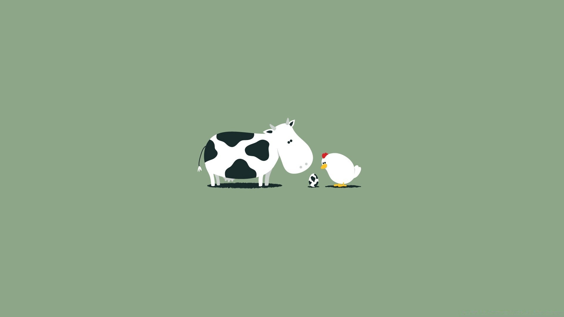 La mucca e la gallina dei cartoni animati guardano l'uovo macchiato