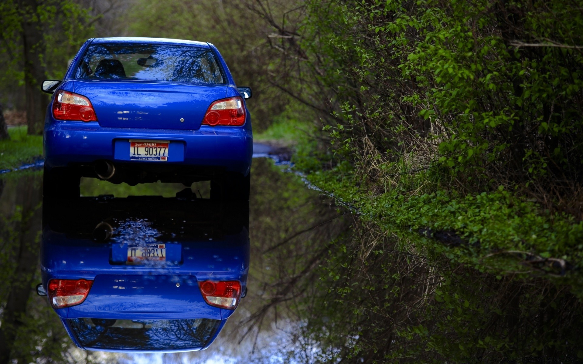 Auto blu sulla strada bagnata