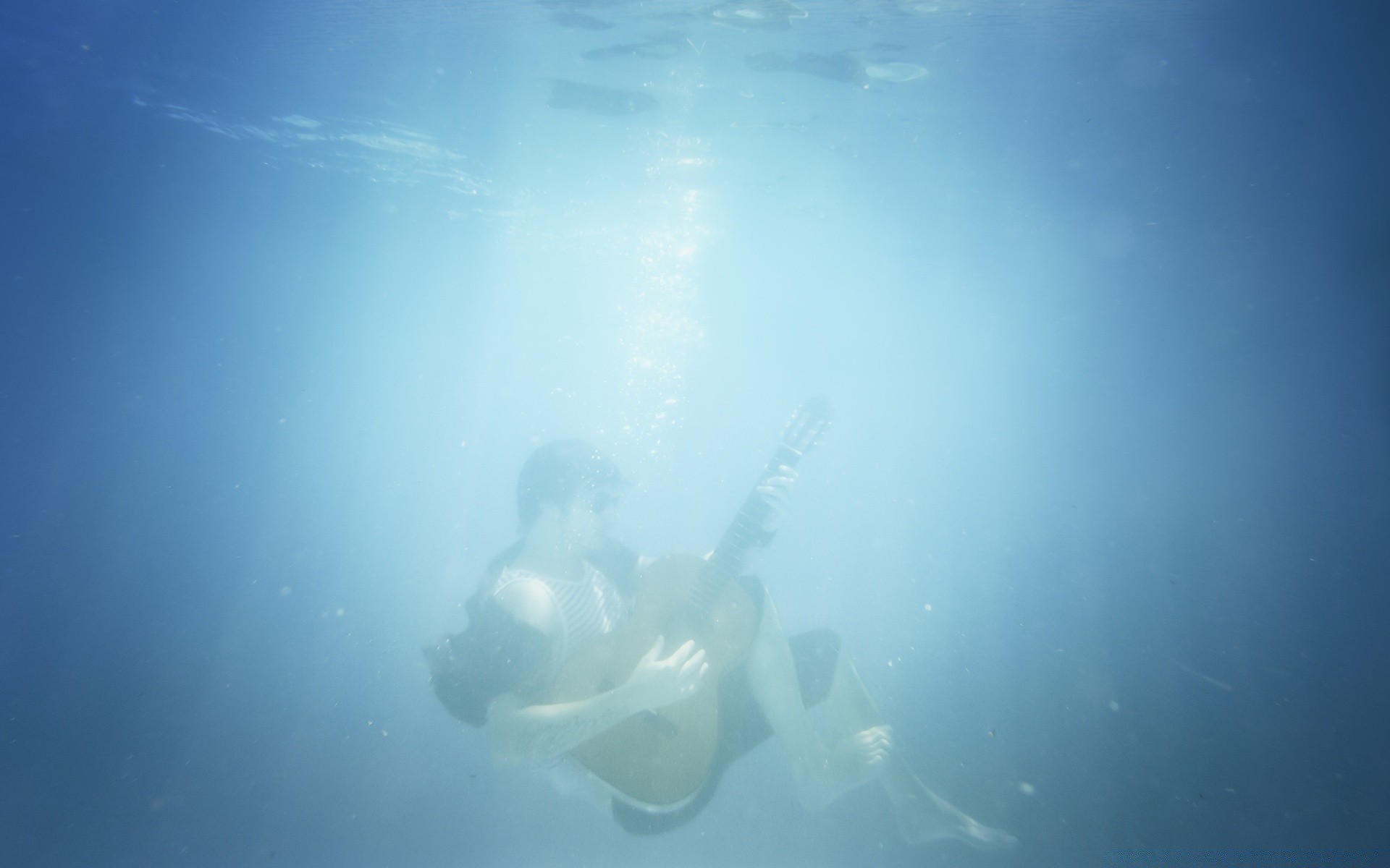 Immagine di un musicista con una chitarra sott'acquaImmagine di un musicista con una chitarra sott'acqua
