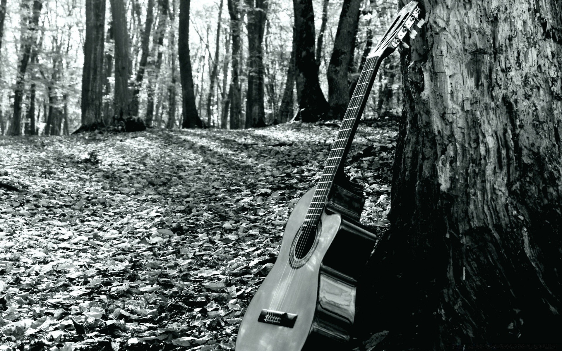 Una chitarra solitaria nel bosco aspetta il suo musicistaUna chitarra solitaria nel bosco aspetta il suo musicista