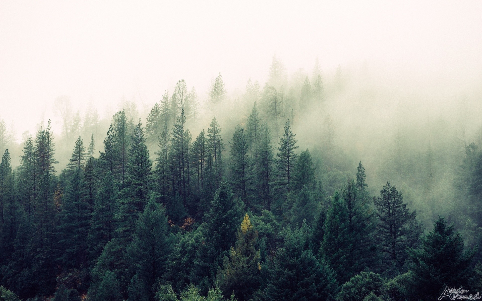 Paesaggio: un enorme albero solitario nella nebbia dell'alba