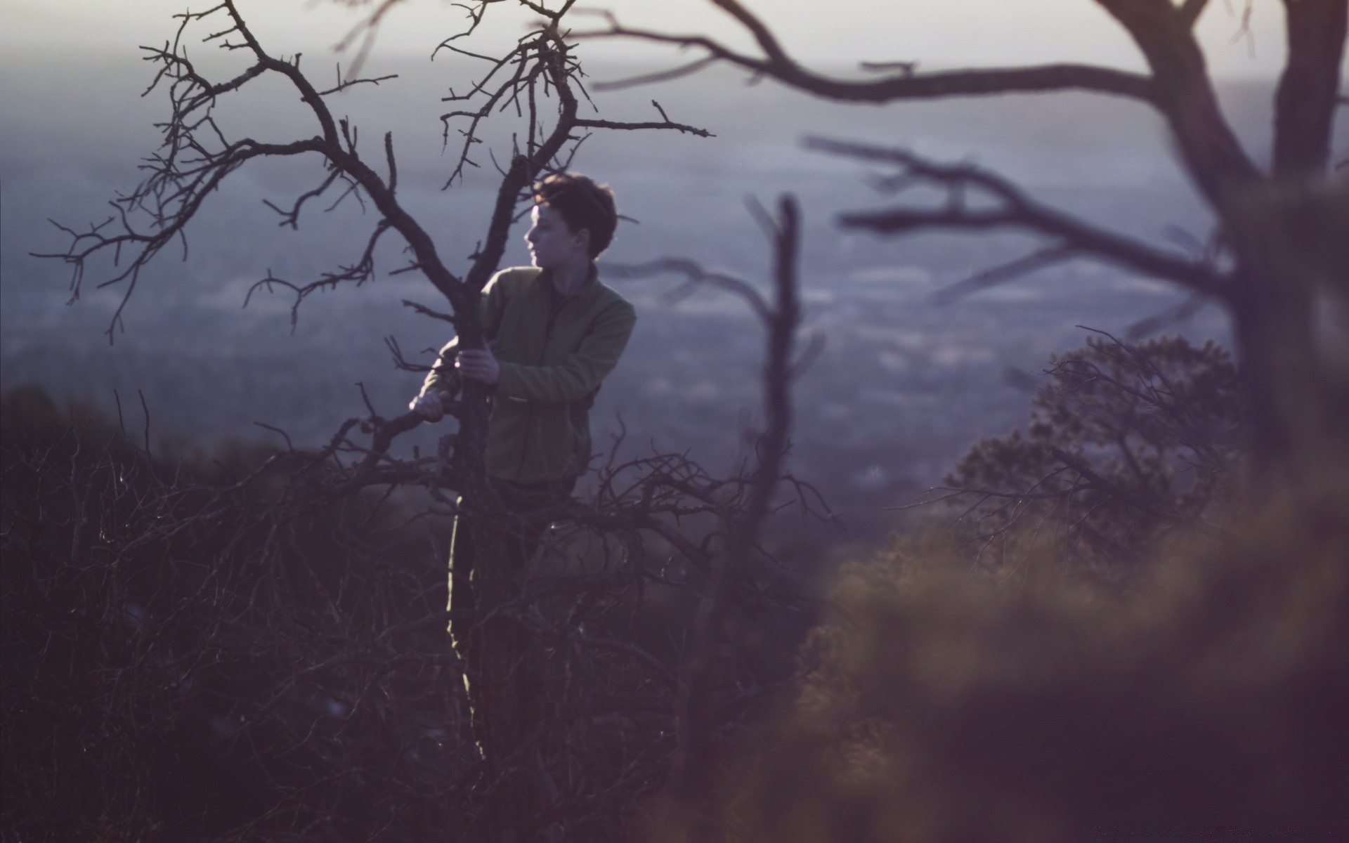 Albero con foglie ingiallite nella foschia della nebbia nella foresta in montagna