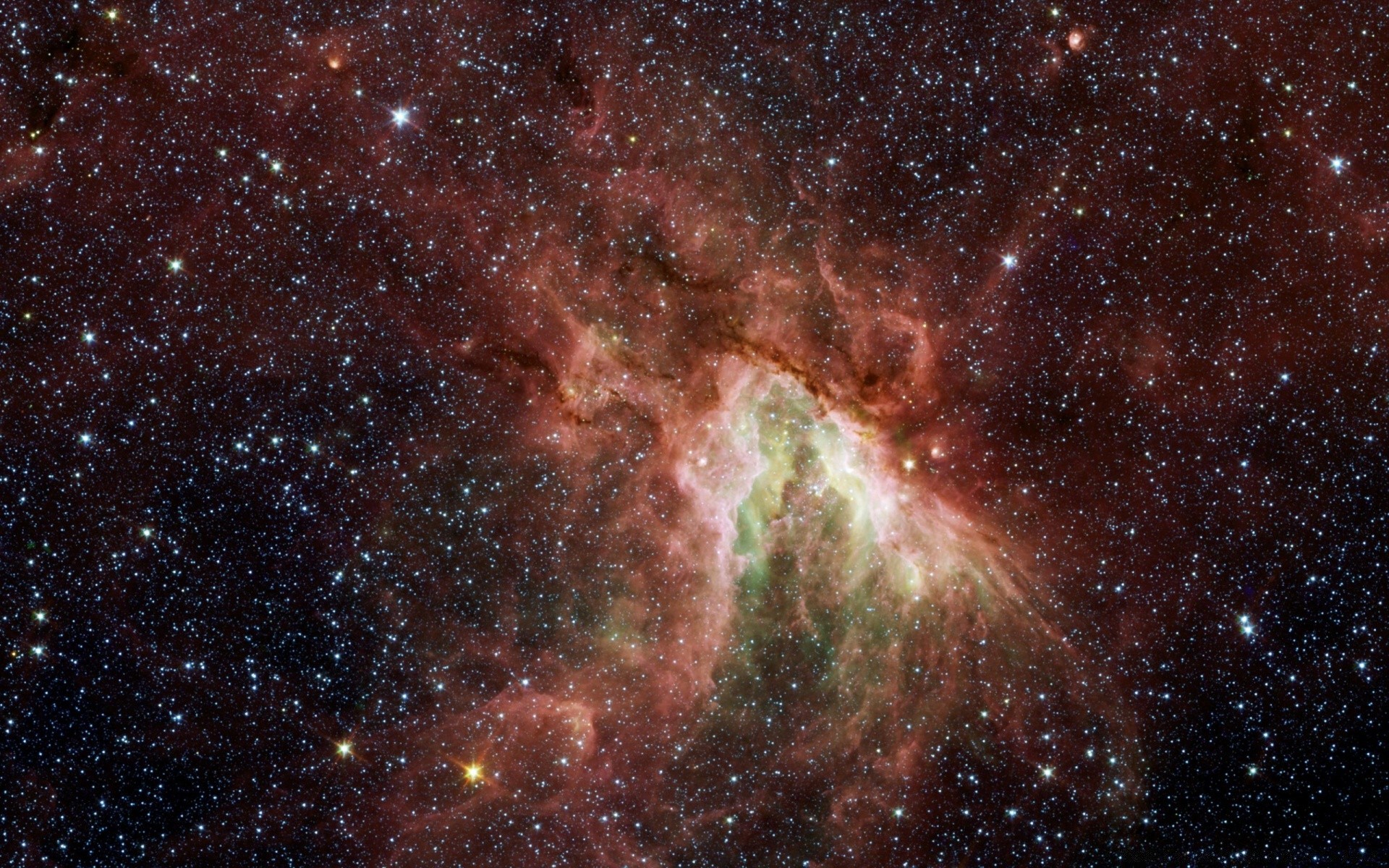 Il pianeta e la Gallattica. Paesaggio spaziale in rosso scuro