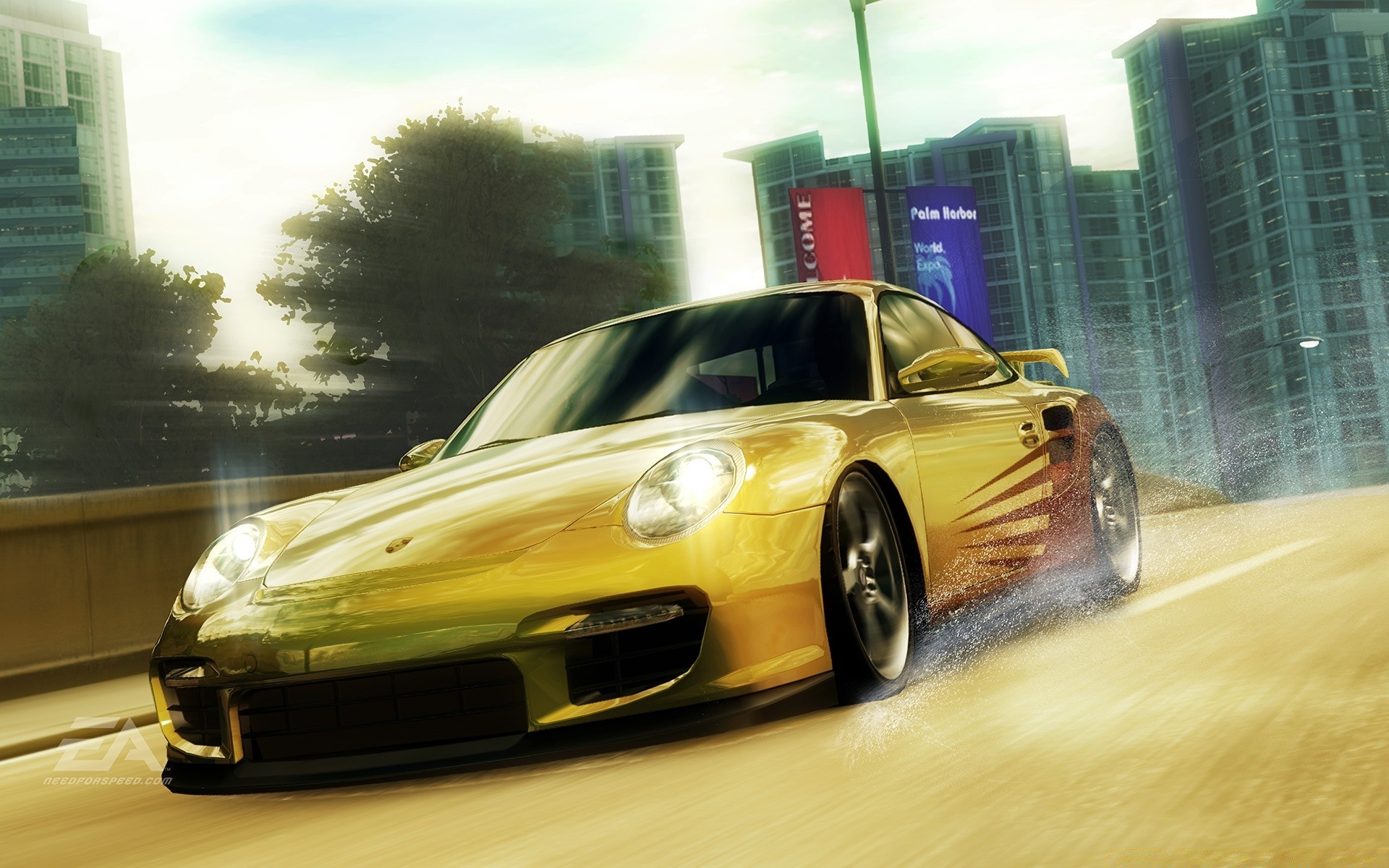 Un'auto gialla che corre lungo la strada