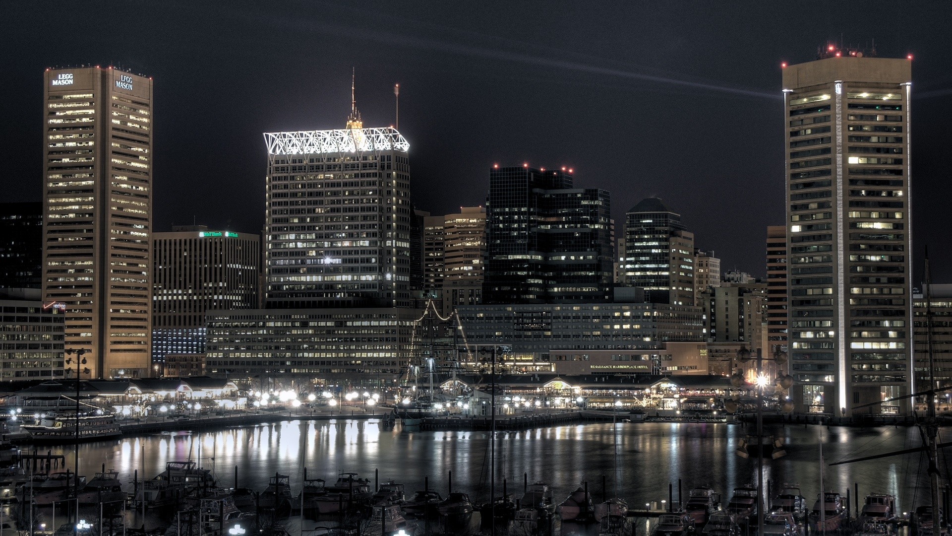 Centro città nelle luci e riflesso nel fiume