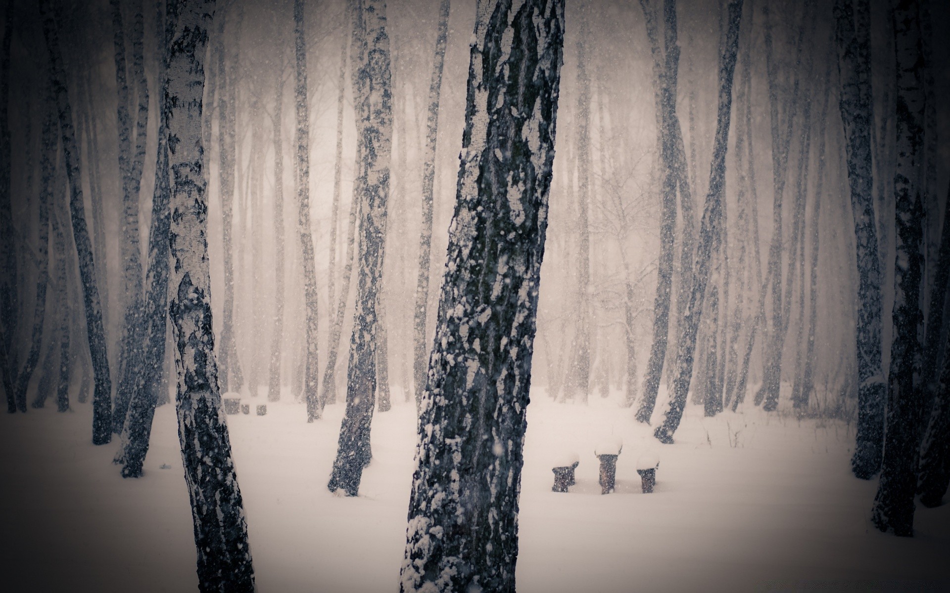 Panchine nella foresta nebbiosa innevata