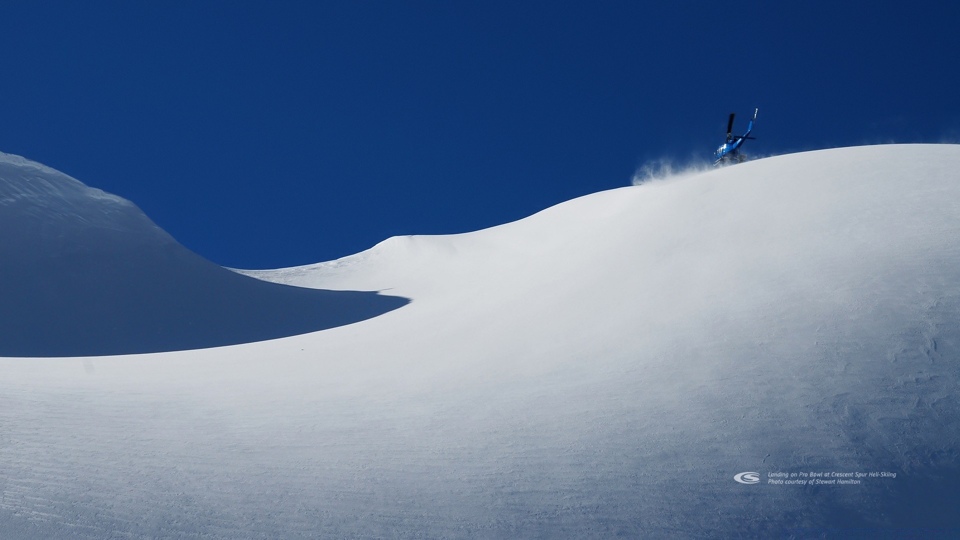 L'elicottero si siede sul pendio nevoso della montagna in una giornata limpidaL'elicottero si siede sul pendio nevoso della montagna in una giornata limpida