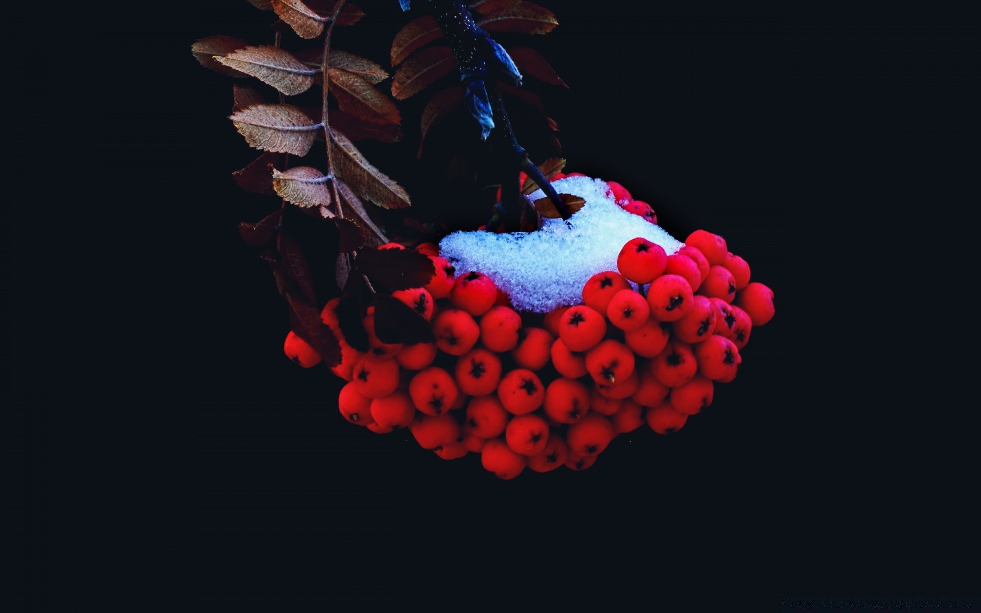 Grappolo di cenere di montagna nella neve bianca
