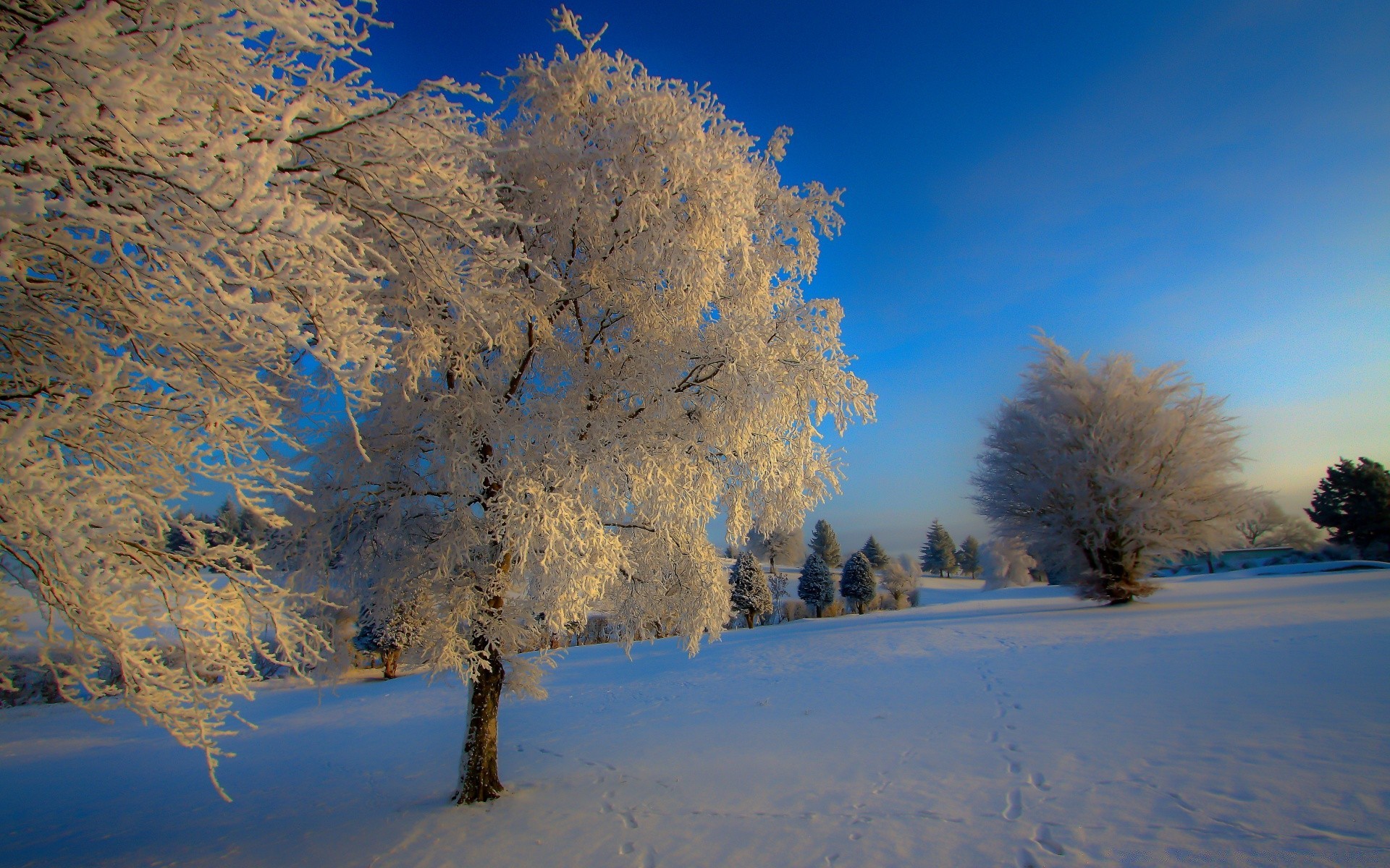 Tramonto invernale e albero nella neve