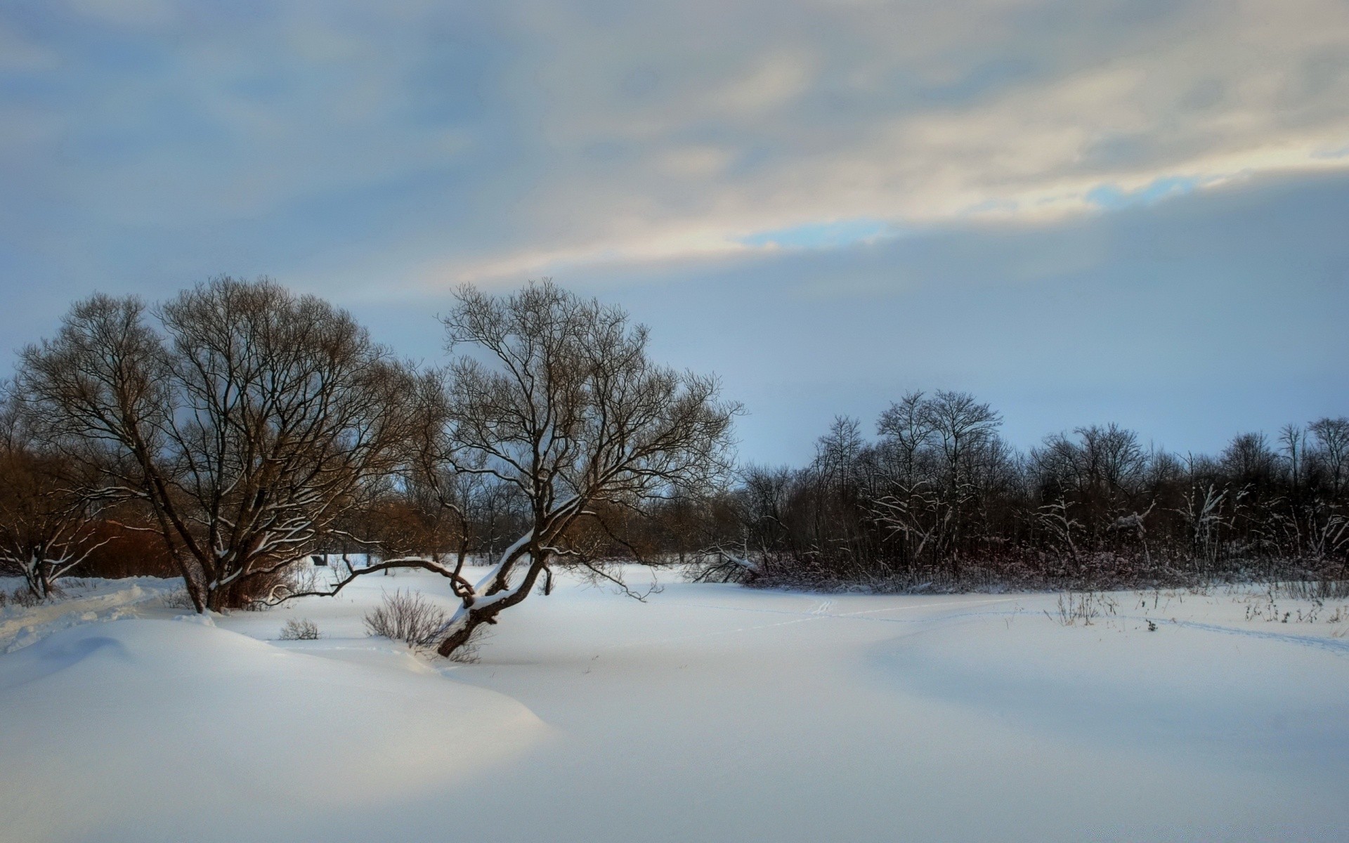 Paesaggio invernale, nel mezzo dell'acqua, ai lati degli alberi nella neve