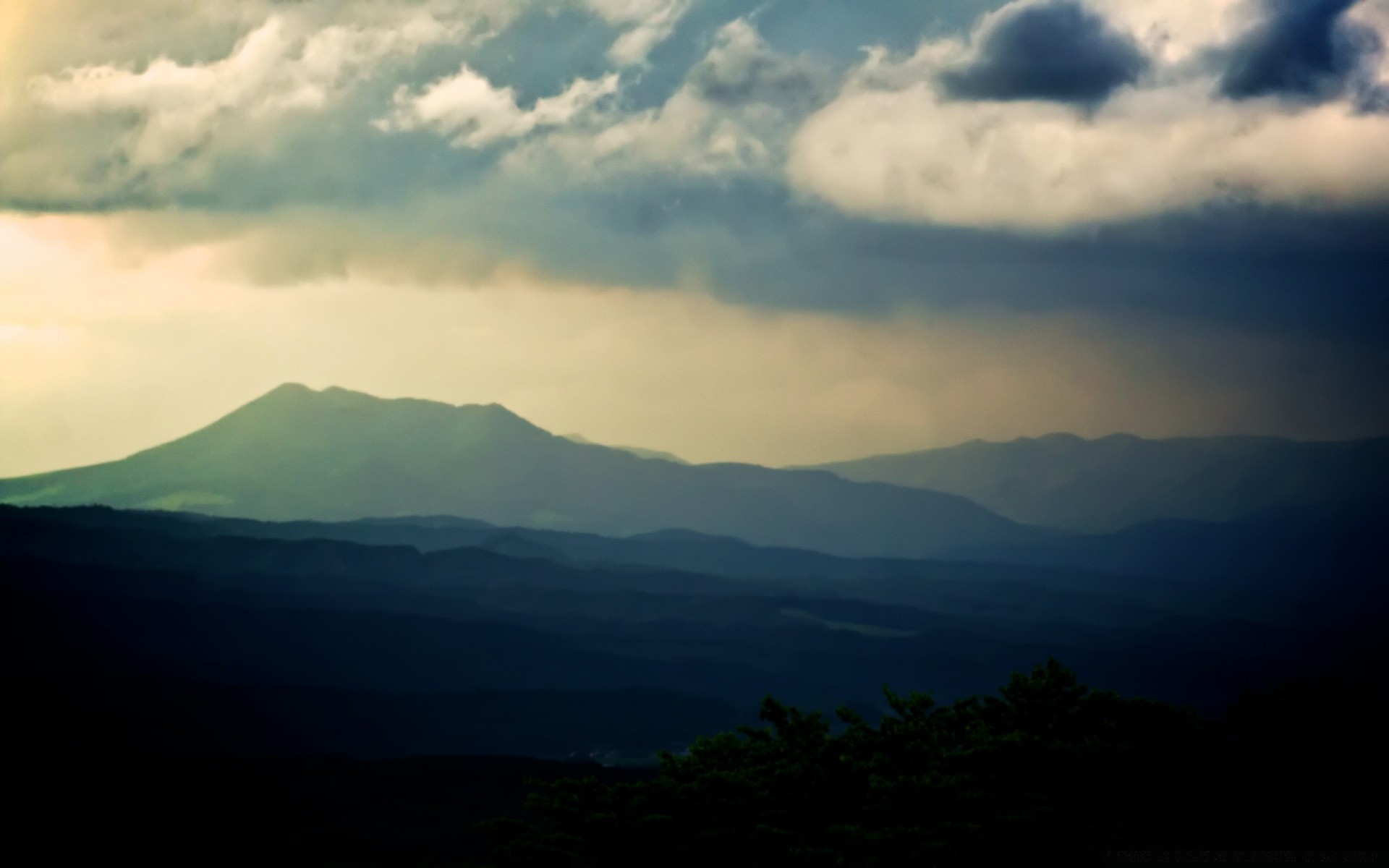 Bellissimo paesaggio con vista sulle montagne attraverso la nebbiaBellissimo paesaggio con vista sulle montagne attraverso la nebbia