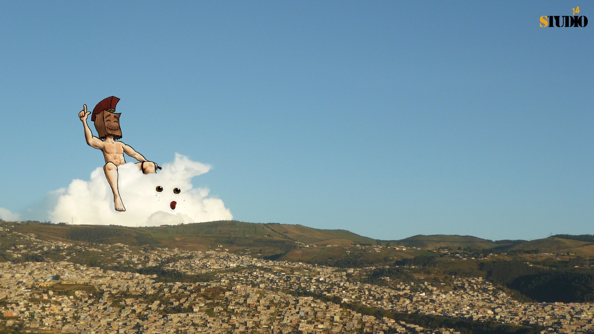Guerriero con un pacchetto sulla testa cavalca una nuvola