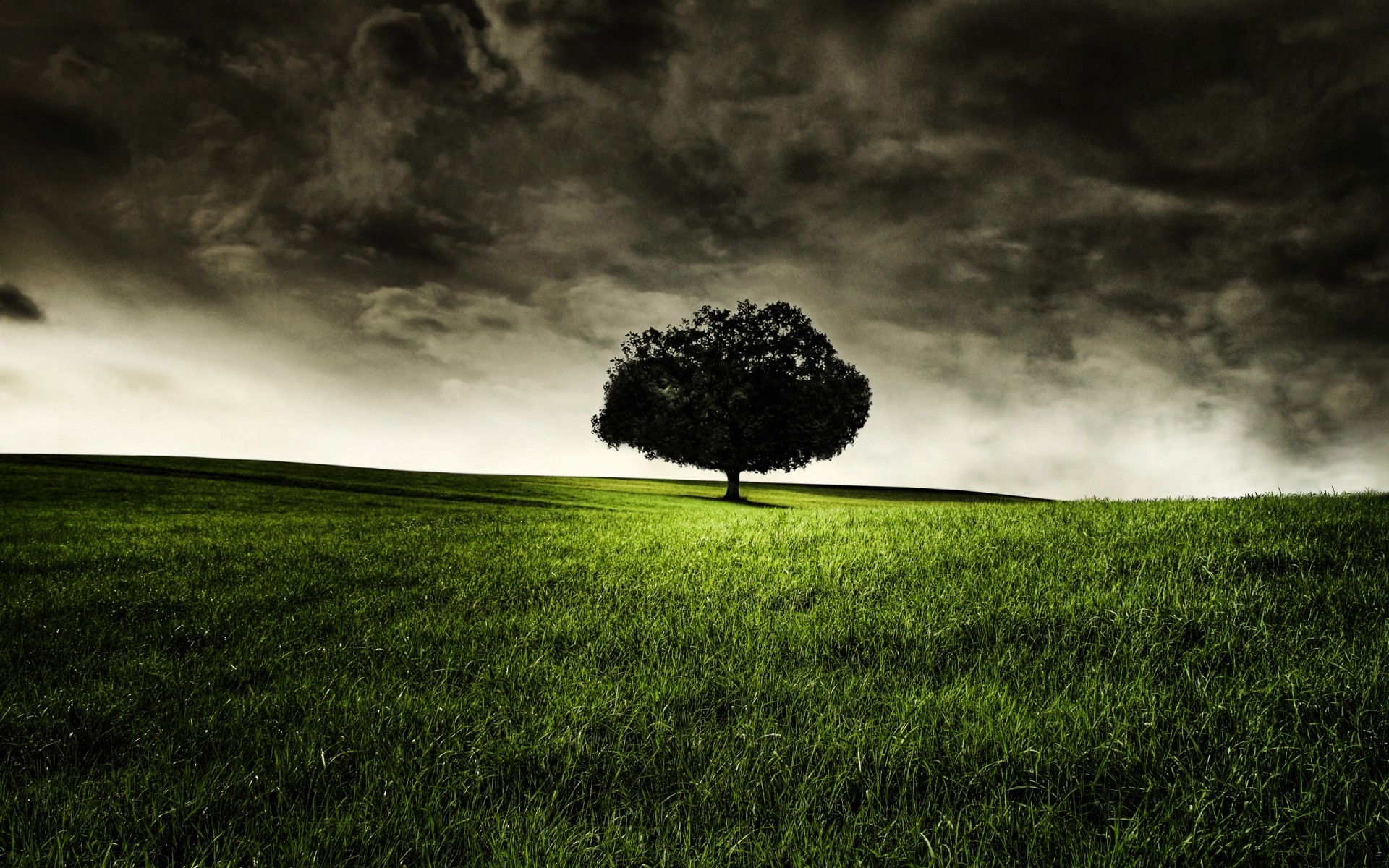 Albero solitario in campo verde con linee creativeAlbero solitario in campo verde con linee creative