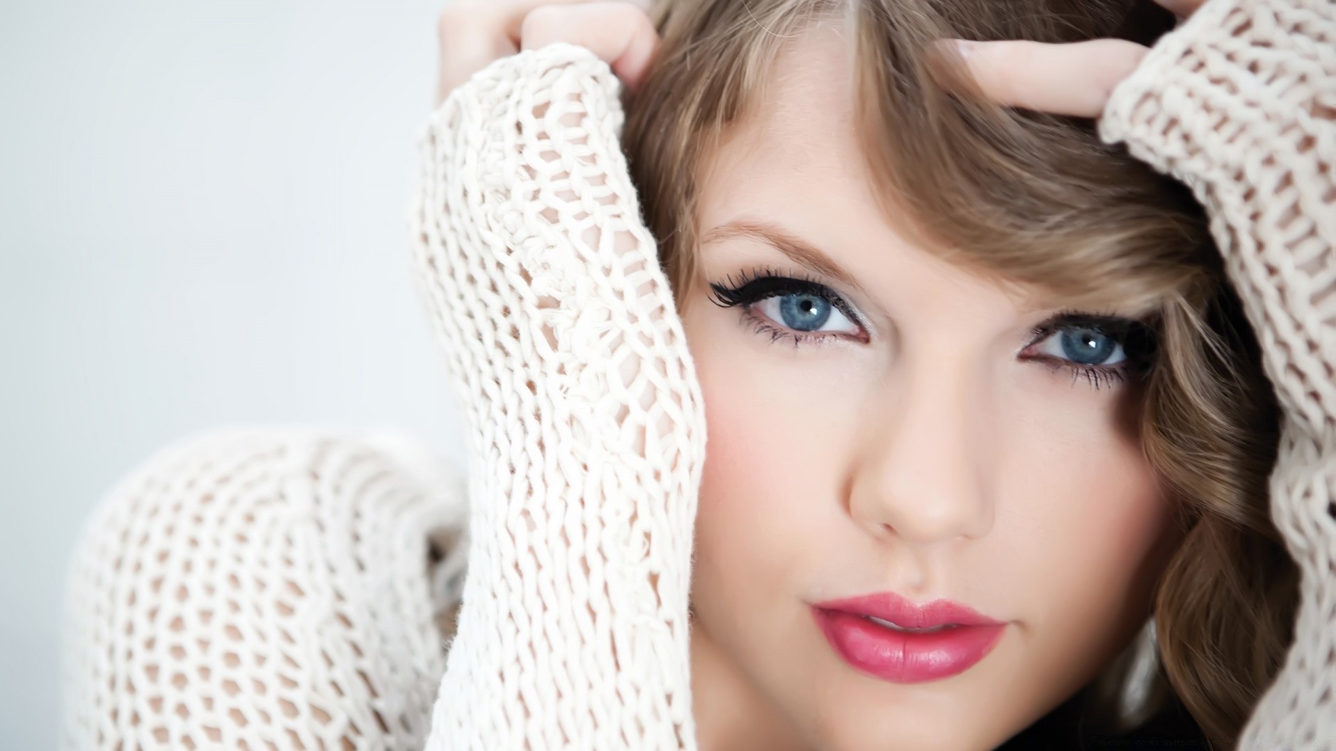 Taylor Swift dagli occhi azzurri con frangia lunga impilata