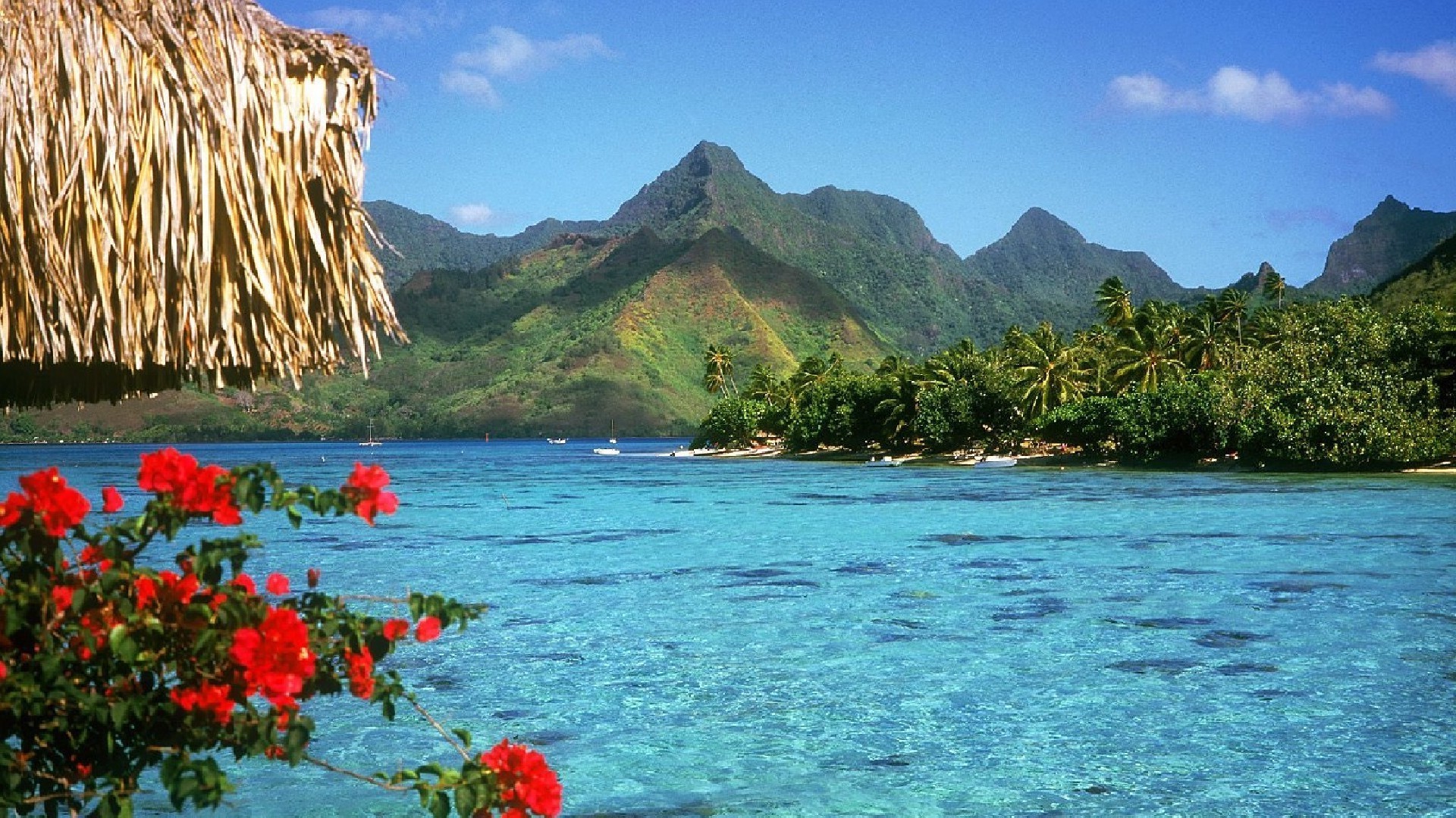 Carta da parati con spiaggia tropicale, oceano e arcobaleno dall'alto