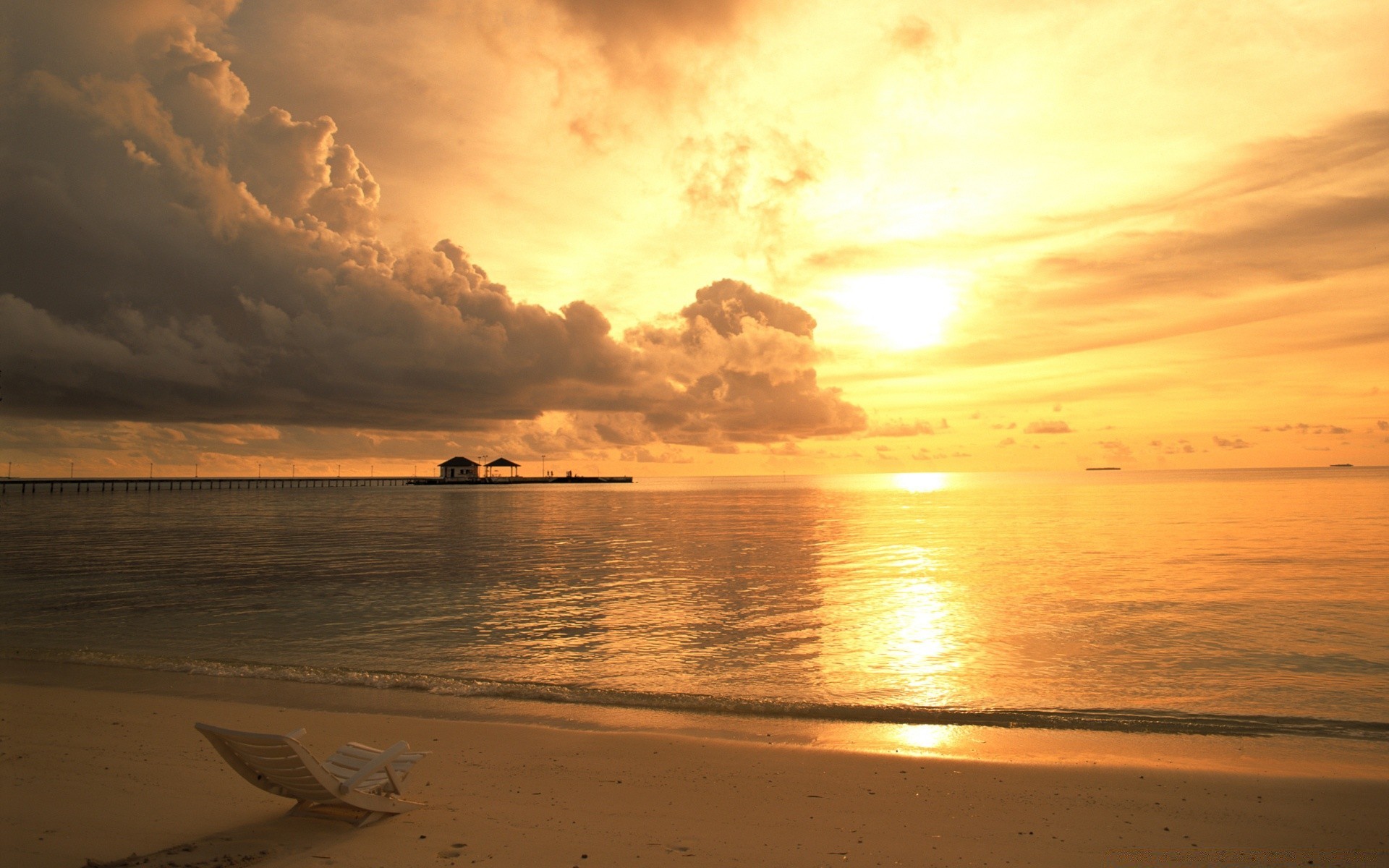 Spiaggia atmosferica con chaise longue e oceano al tramonto