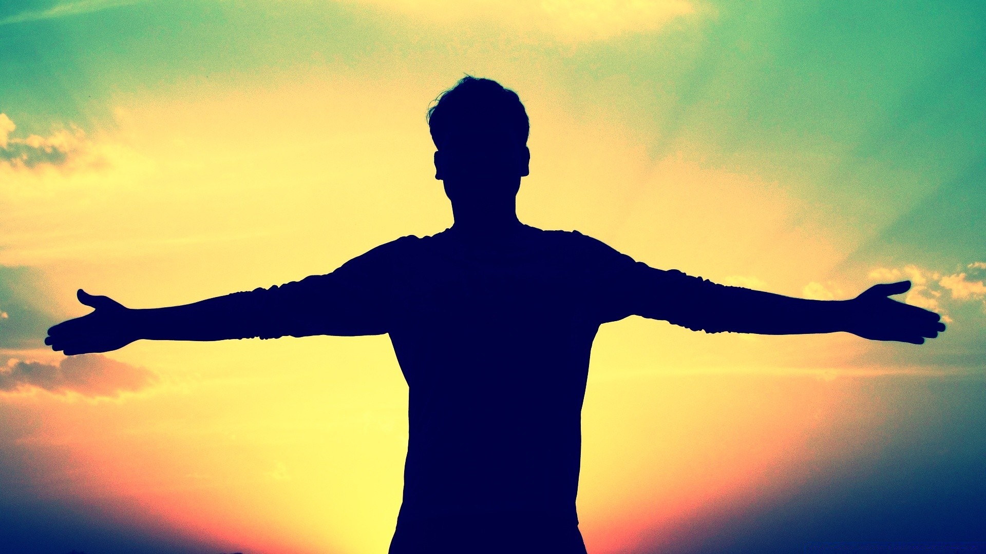 Silhouette maschile nero su uno sfondo di cielo con Tramonto illuminato