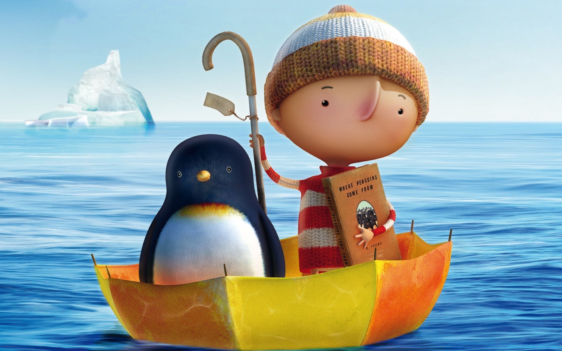 Ragazzo e pinguino che galleggiano sul mare in un ombrello