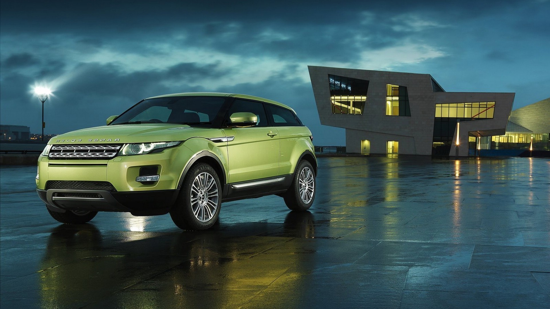 Crossover verde su asfalto bagnato