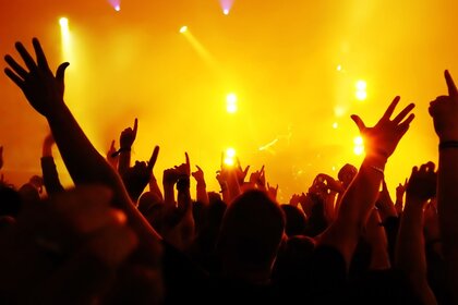 Uno spettacolo al festival musicale, un'arena piena di pubblico, uno scenario enorme sul palcoUno spettacolo al festival musicale, un'arena piena di pubblico, uno scenario enorme sul palco