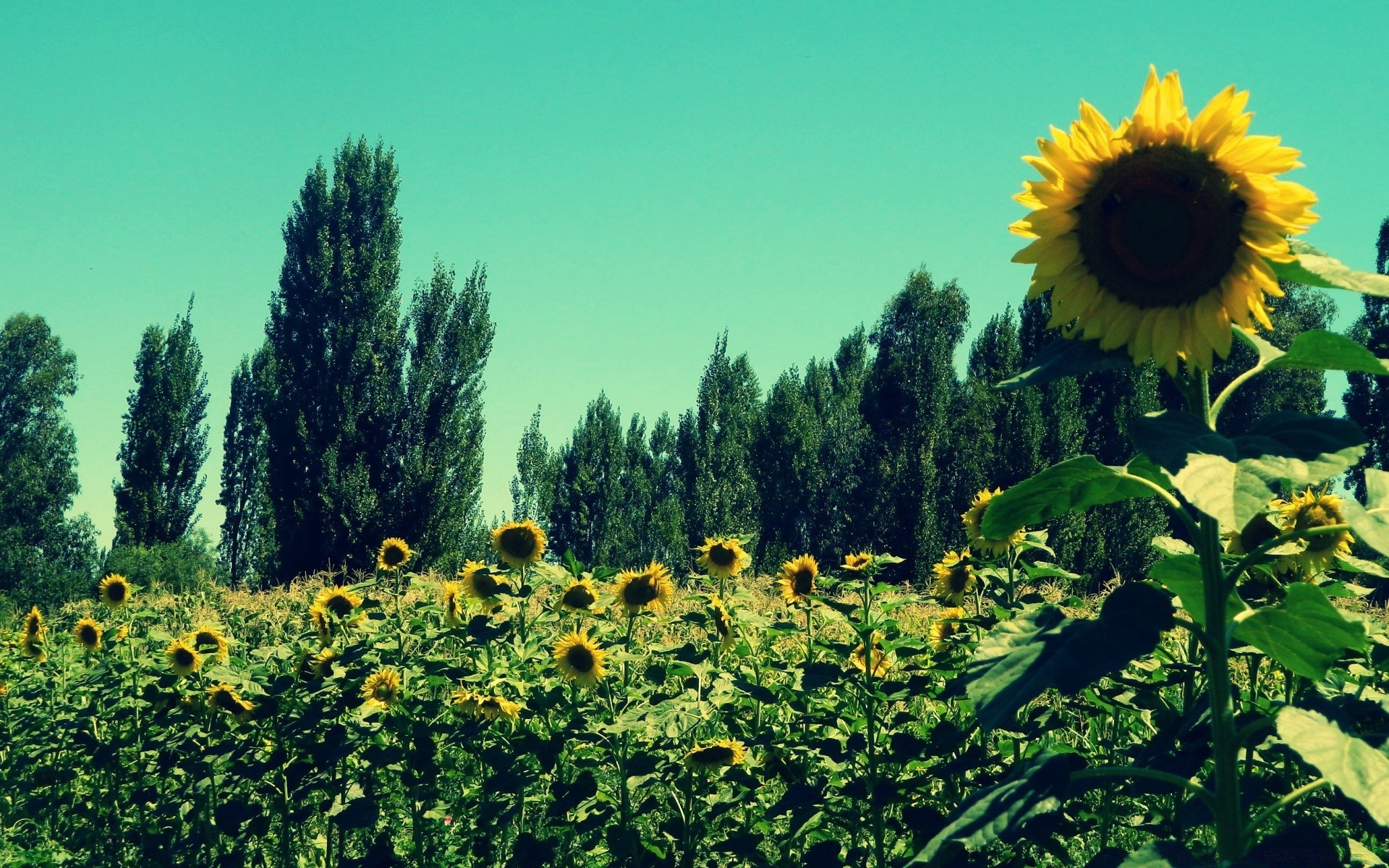 Pioppi verdi e girasoli in fiore-piena estate