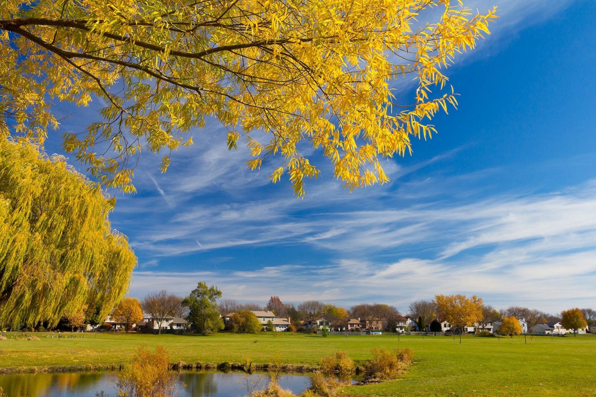 Salice stagno case cielo autunno alberi villaggio prato pace