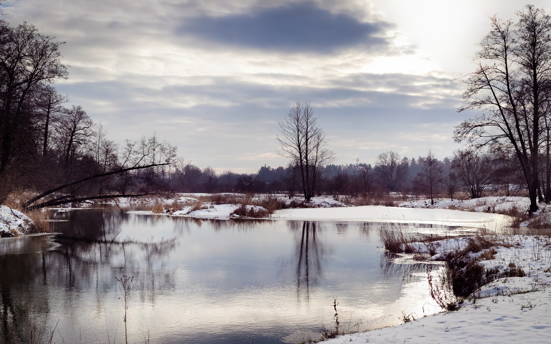 Paesaggio serale: montagne illuminate dal luminare notturno e un lago