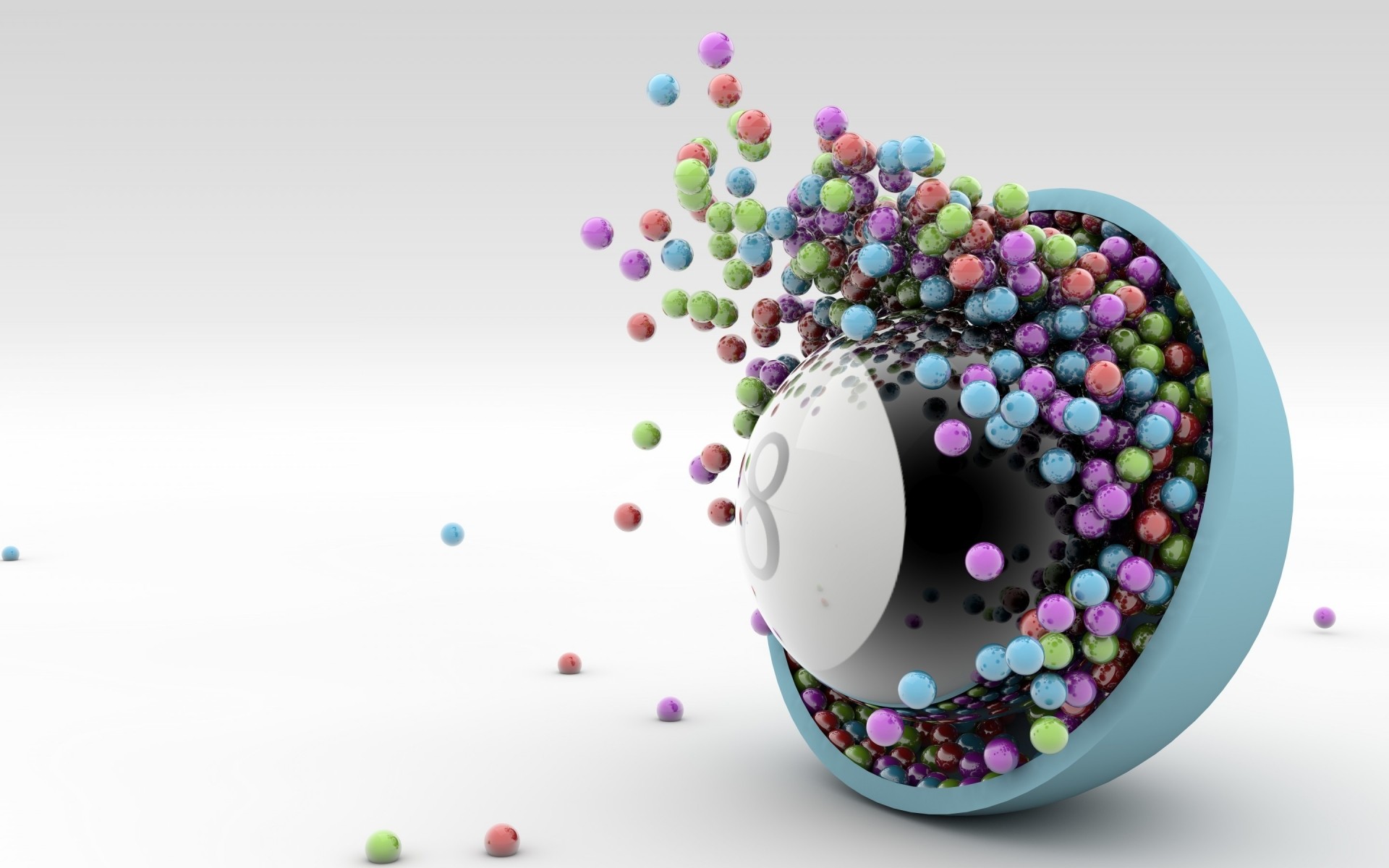 Su uno sfondo blu, una palla tagliata bianca in cui gli oggetti verdi