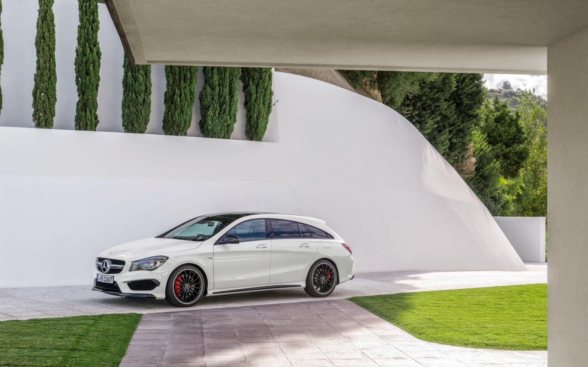 Auto mercedes-benz bianca nel cortile su sfondo muro bianco
