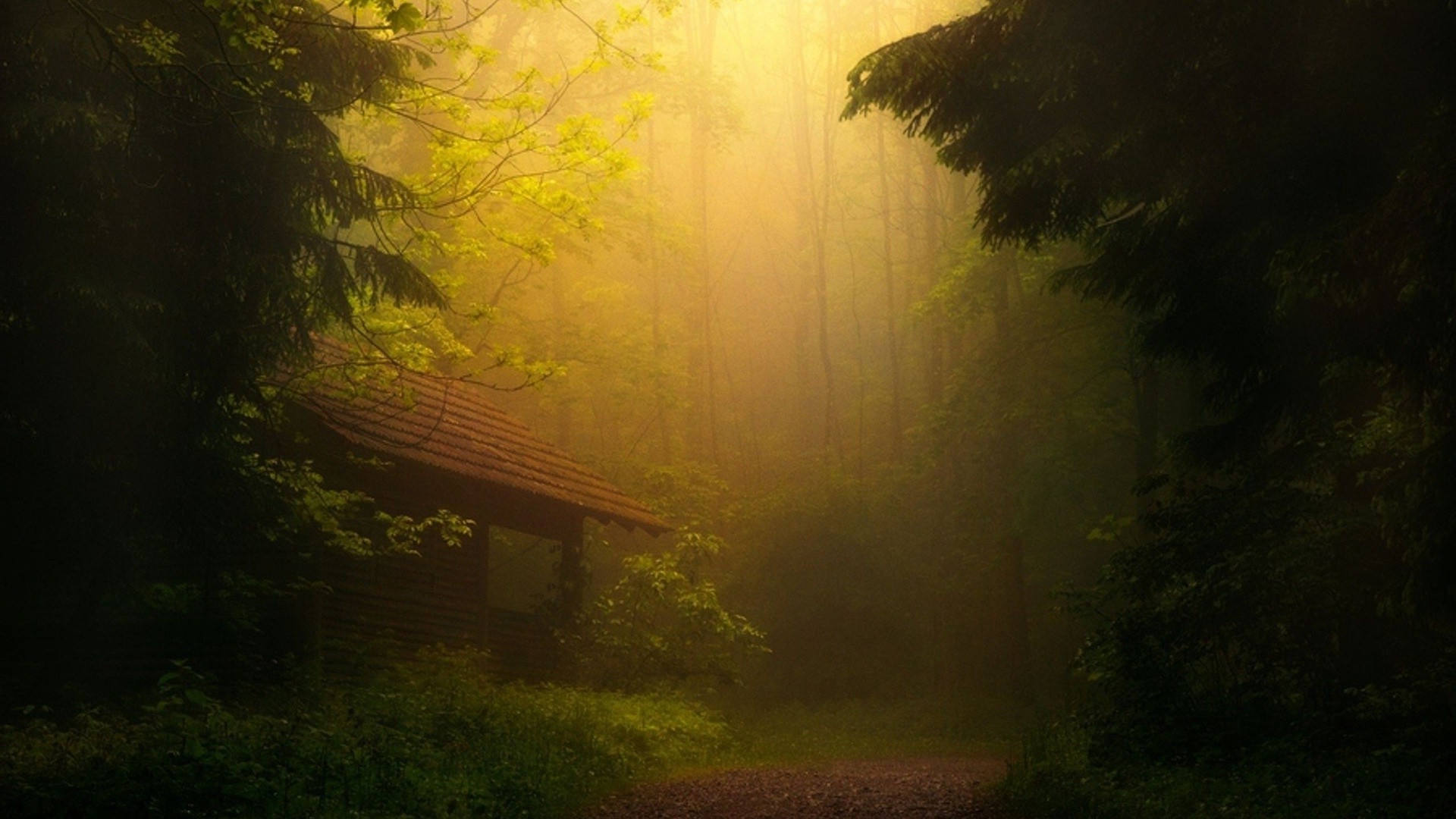 Alba nebbiosa nella capanna della foresta
