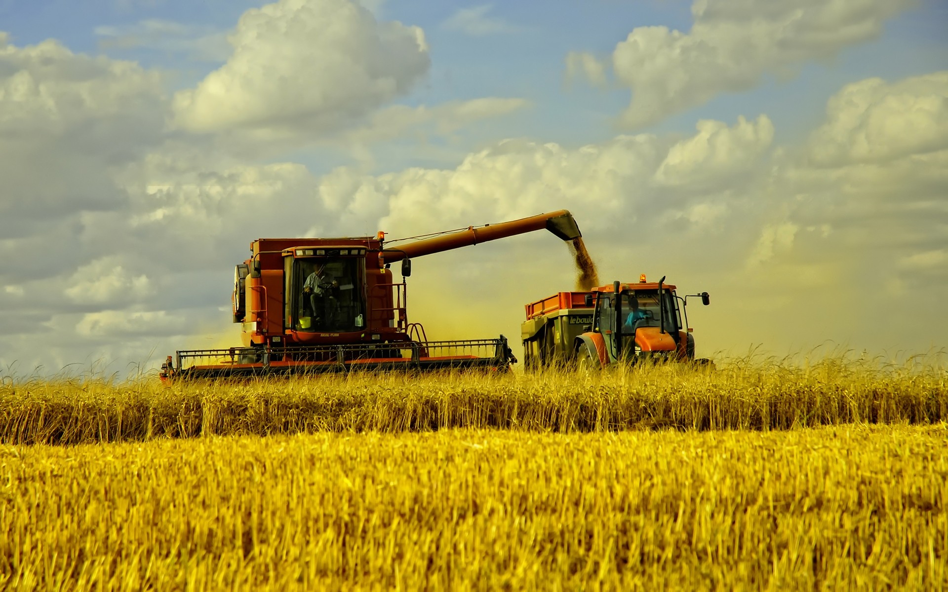 Mucchi di fieno su un campo smussato con paesaggio di grano