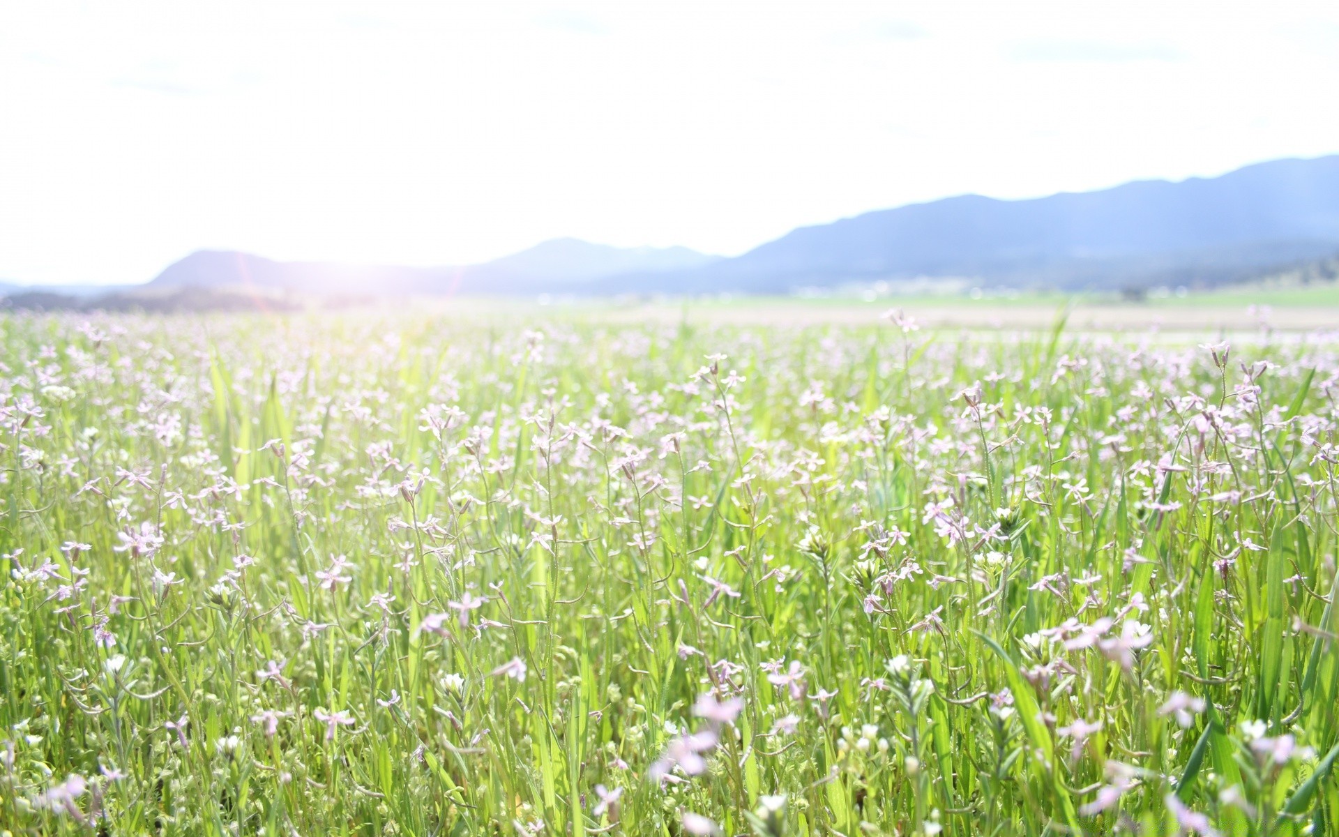 Vista sulle montagne e sul lago ai raggi dell'alba