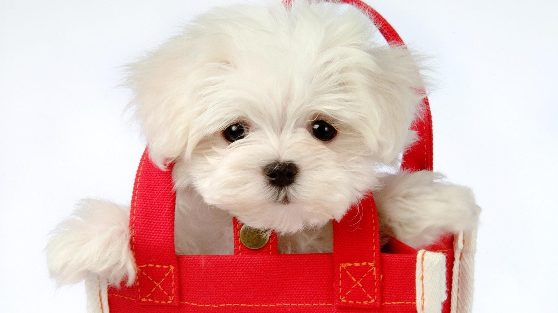 Cucciolo bianco in una borsa rossa