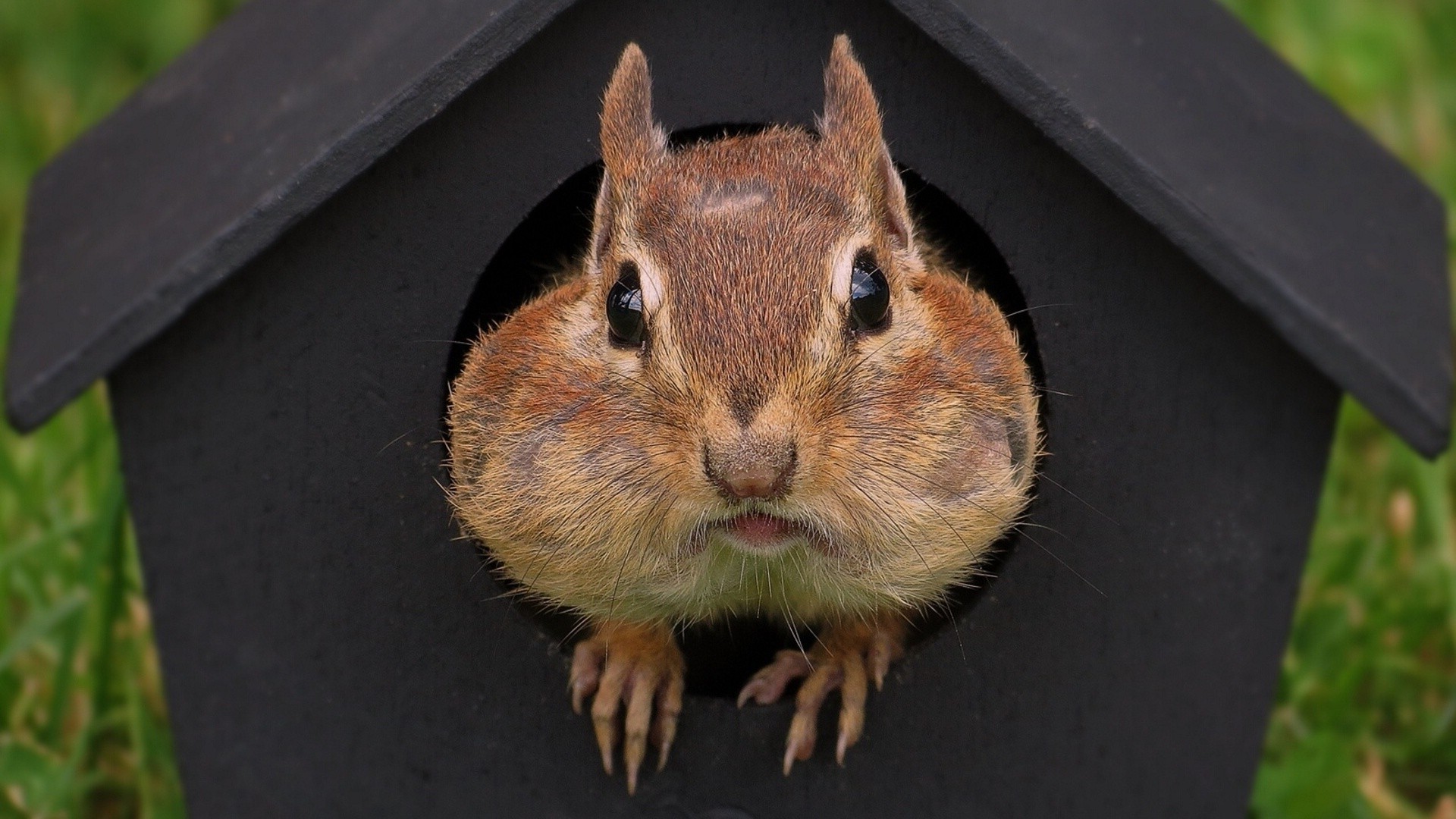 Il muso del criceto sporge dalla casetta per gli uccelli