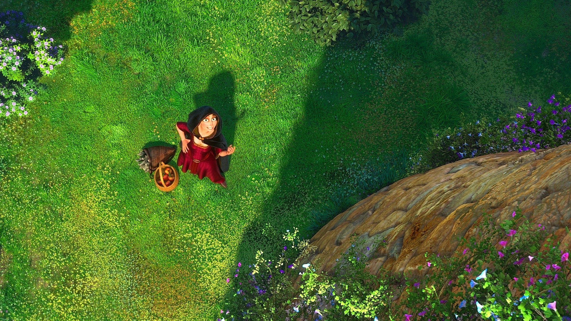 Personaggio Dei Cartoni animati Rapunzel vicino alla torre su sfondo verde brillante