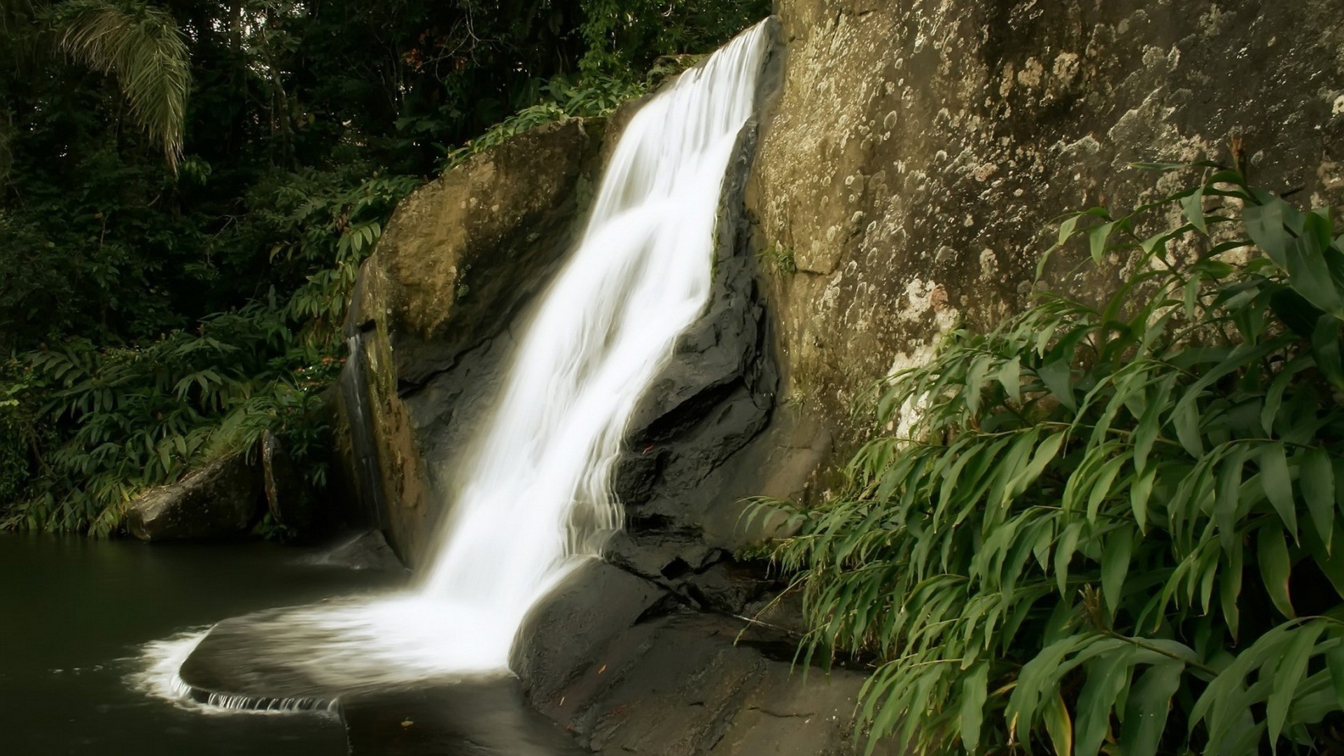 Cascata su sfondo di montagna e foglie verdi