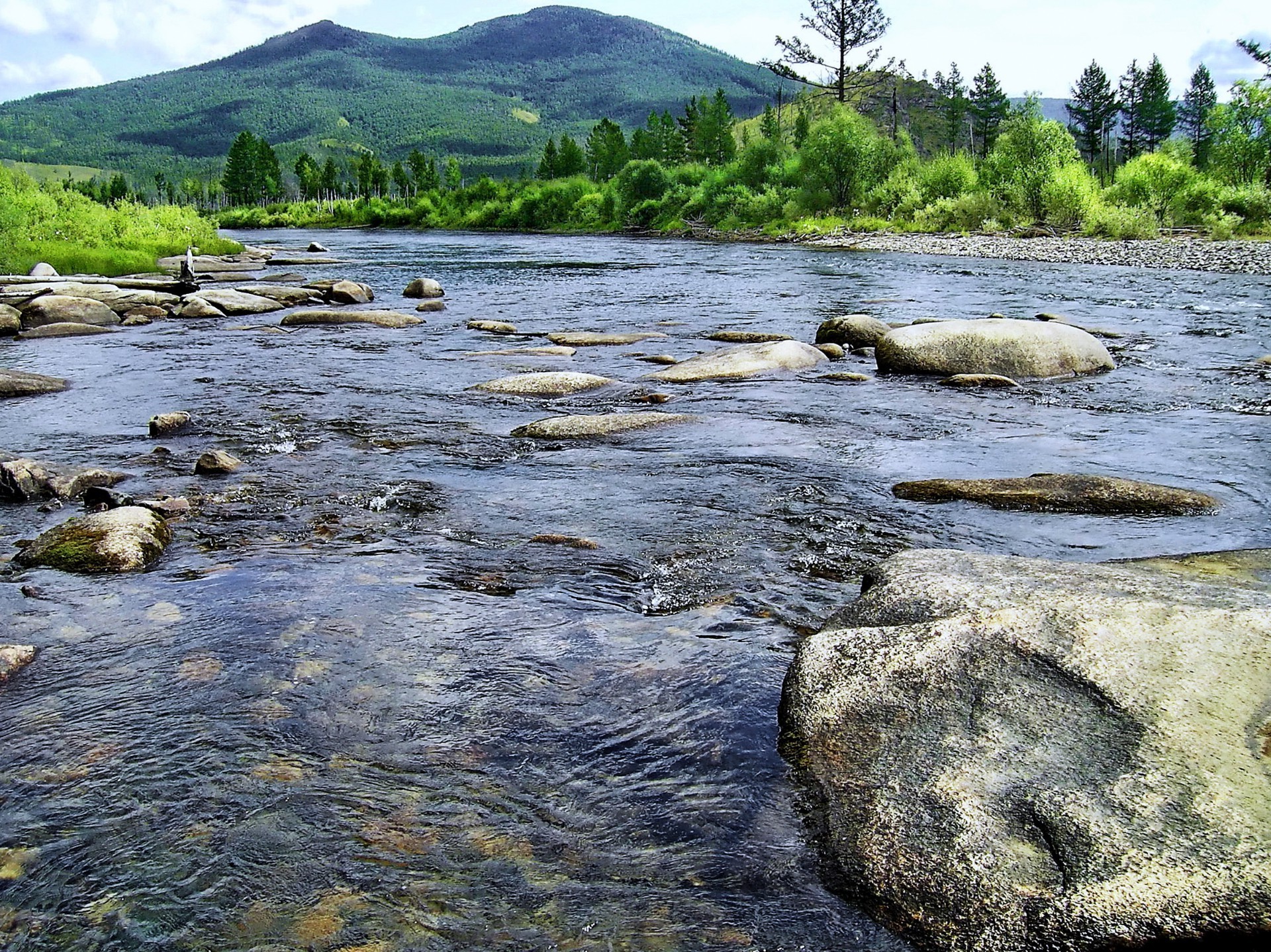 L'acqua limpida scorre lungo il fiume veloce di montagna