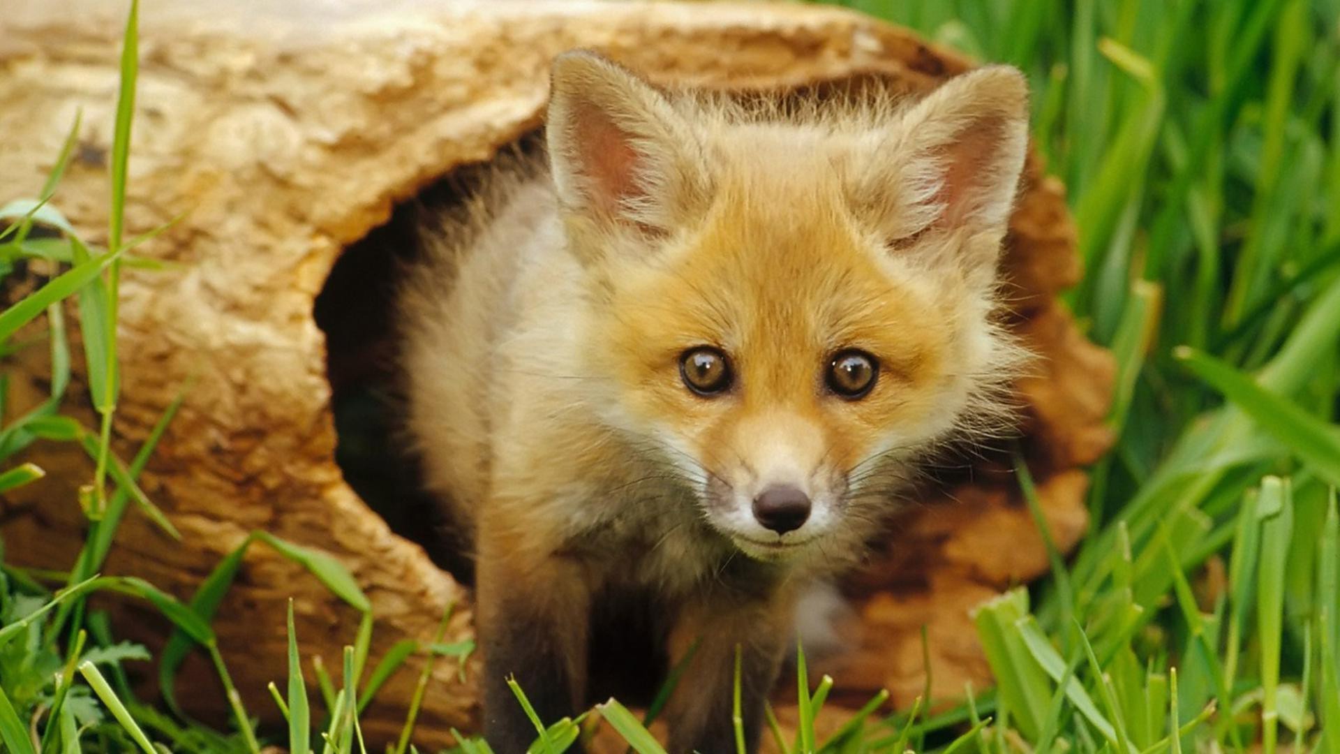 La volpe esce da un vecchio albero cavo