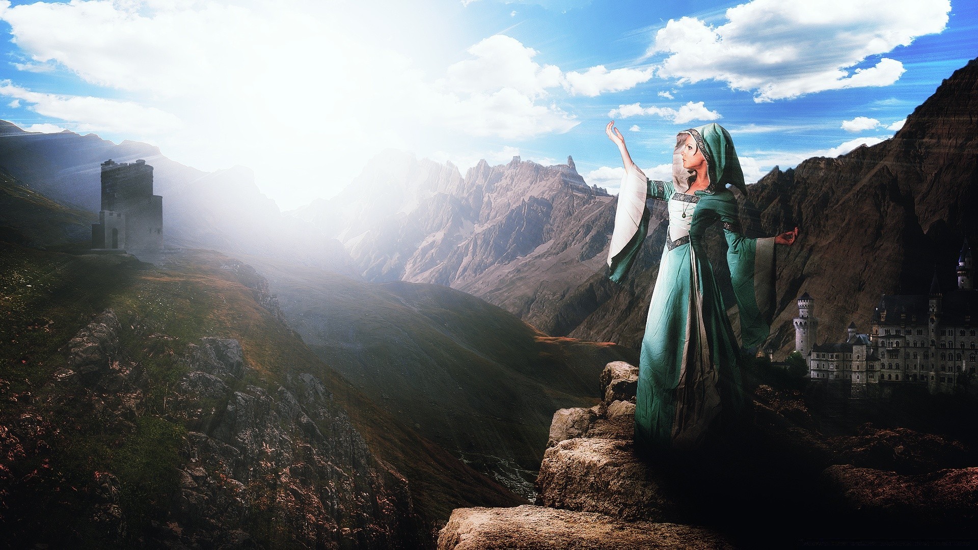 Una ragazza con un mantello in piedi su una montagnaUna ragazza con un mantello in piedi su una montagna