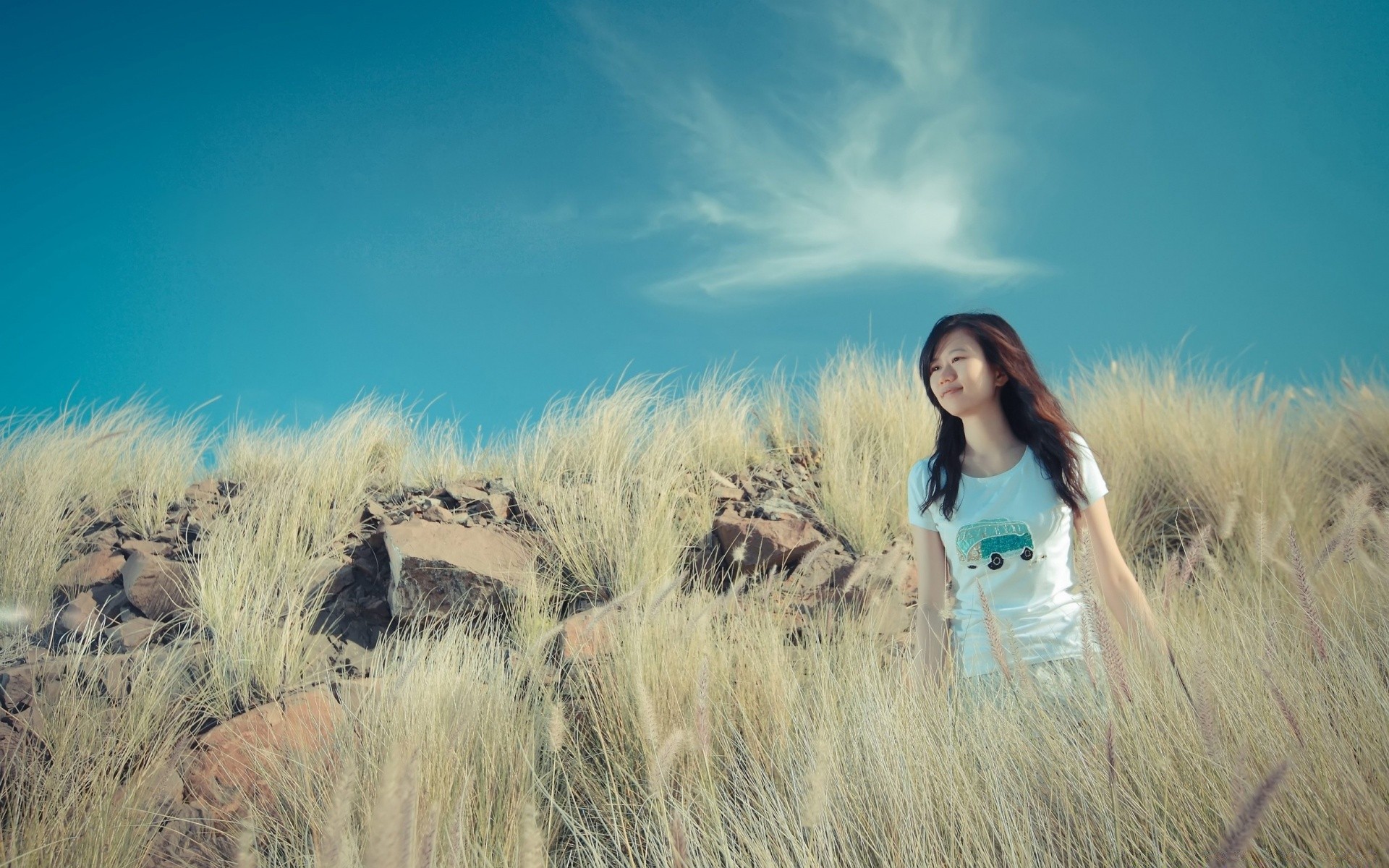 Ragazza sulla natura nelle montagne di pietra nell'erba