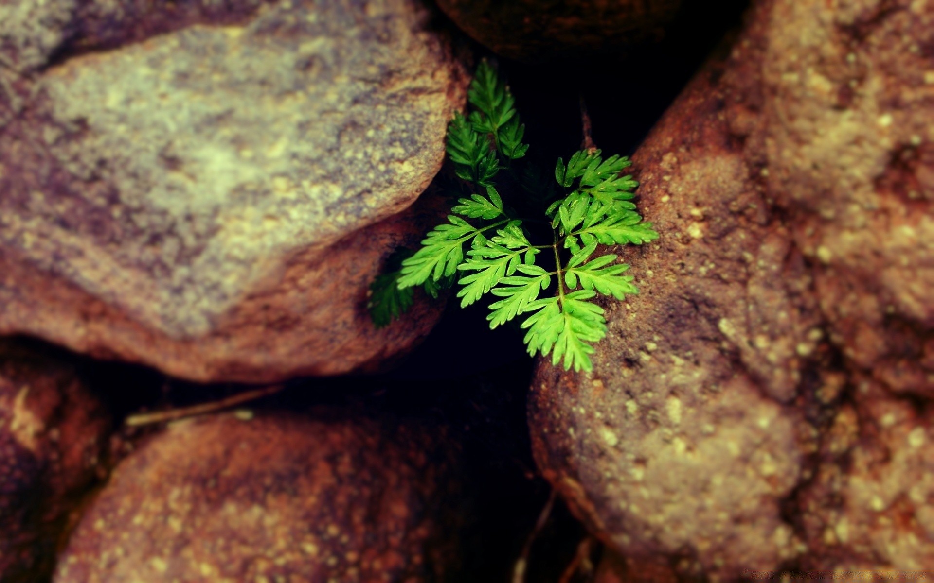 Un ramoscello verde della pianta si fa strada attraverso le pietre