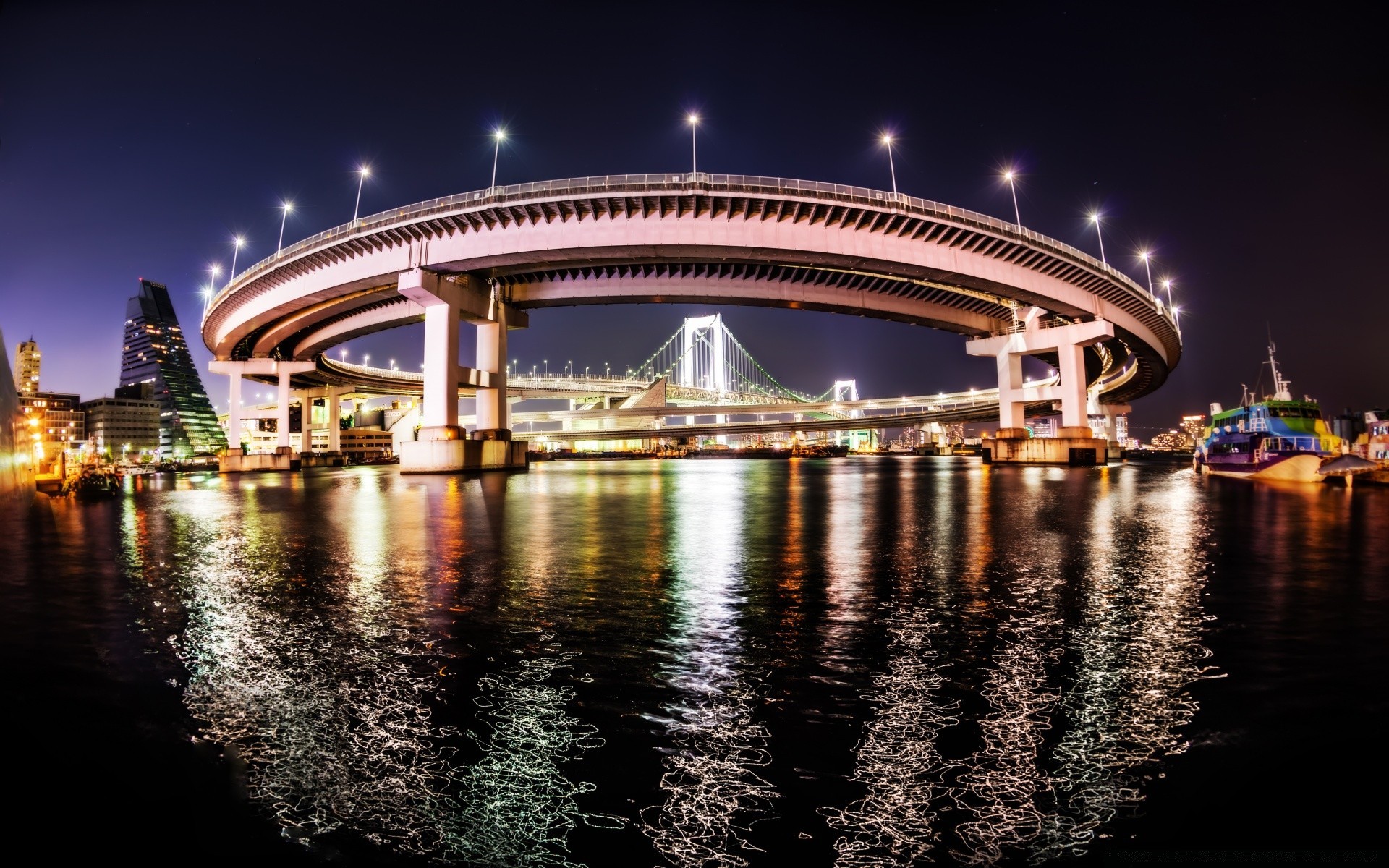 Tramonto nel cielo dietro il ponte sullo sfondo dell'acqua in un'altra città